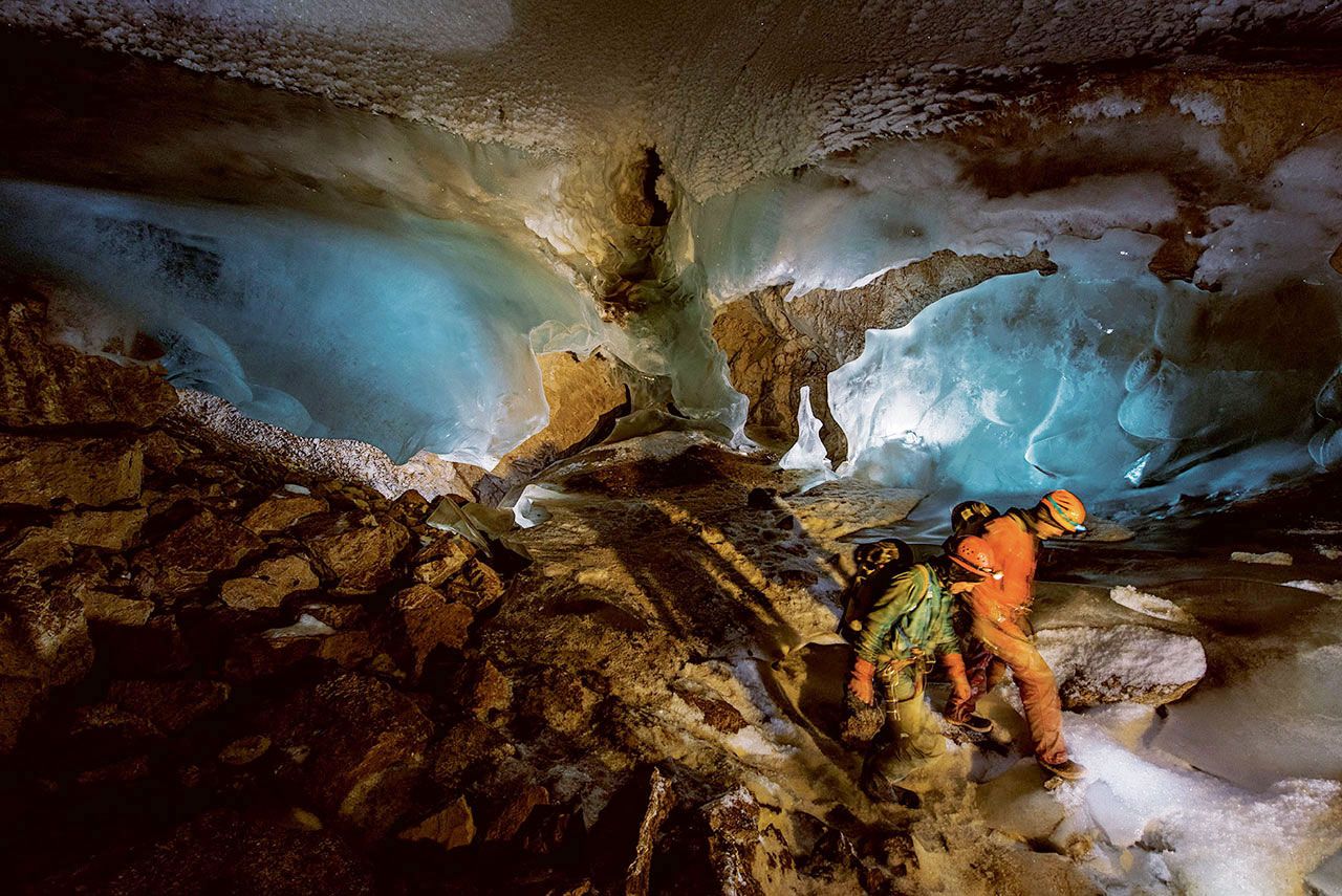 อุณหภูมินอกถ้ำร้อนจัดถึง 38 องศาเซลเซียส แต่ในถ้ำอยู่ระหว่าง -1 ถึง 3 องศาเซลเซียส อุณหภูมิที่ต่างกันเล็กน้อยนี้ส่งผลกระทบใหญ่หลวงต่อภูมิทัศน์ในถ้ำ เมื่อทีมสำรวจไต่ลึกลงไป น้ำแข็งสีฟ้าก็กลายเป็นหินเปลือยๆ