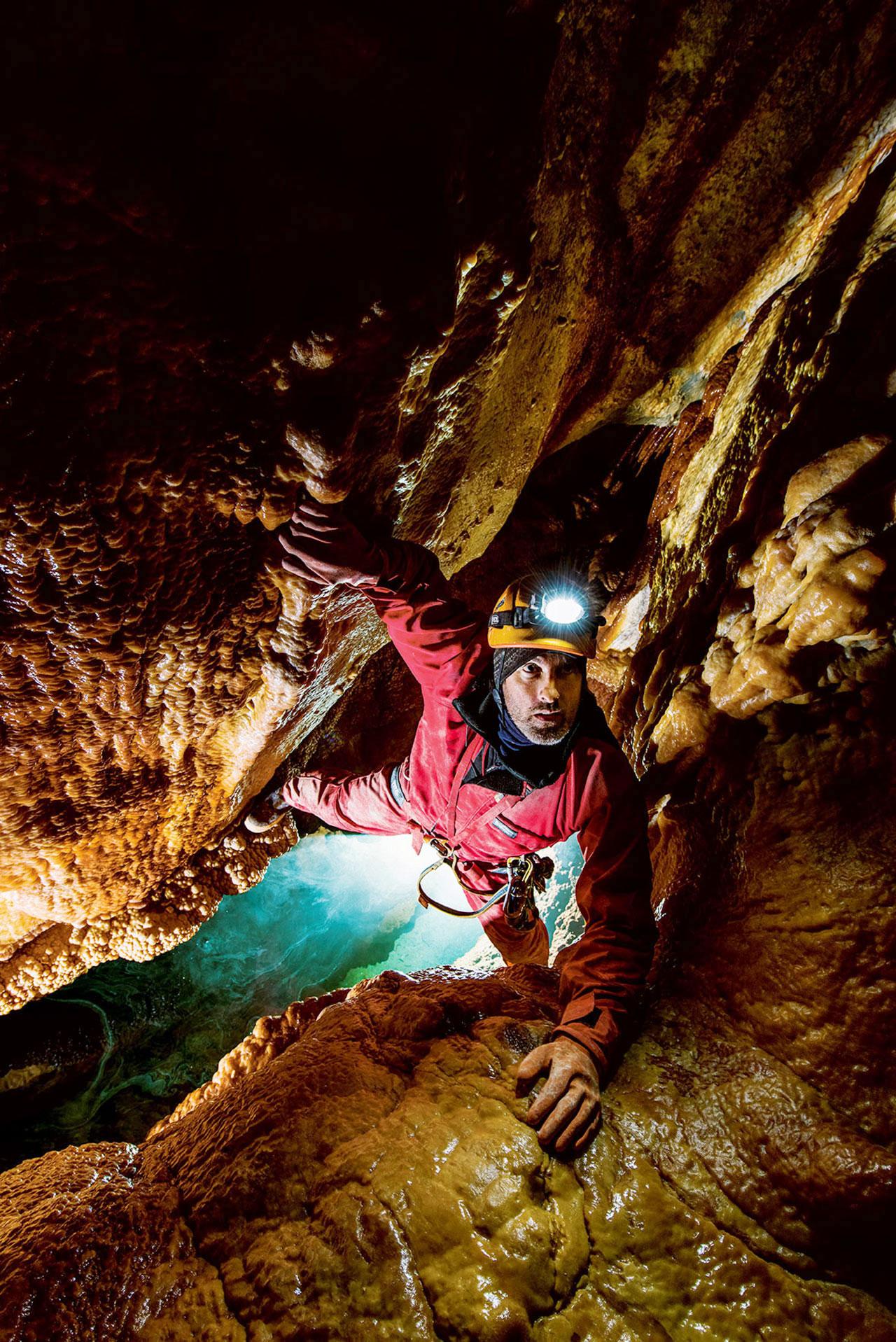 ซินนอตต์ซึ่งยืนเกาะอยู่บนหินลื่นๆ รู้ดีว่า การตกน้ำที่เย็นยะเยือกไม่ใช่ทางเลือก ในถ้ำที่ชุดเปียกน้ำไม่มีวันแห้งเช่นนี้ ภาวะตัวเย็นเกิน ข้อเท้าหัก หรือการหลงทาง เป็นตัวอย่างเพียงน้อยนิดของความเสี่ยงในดาร์กสตาร์