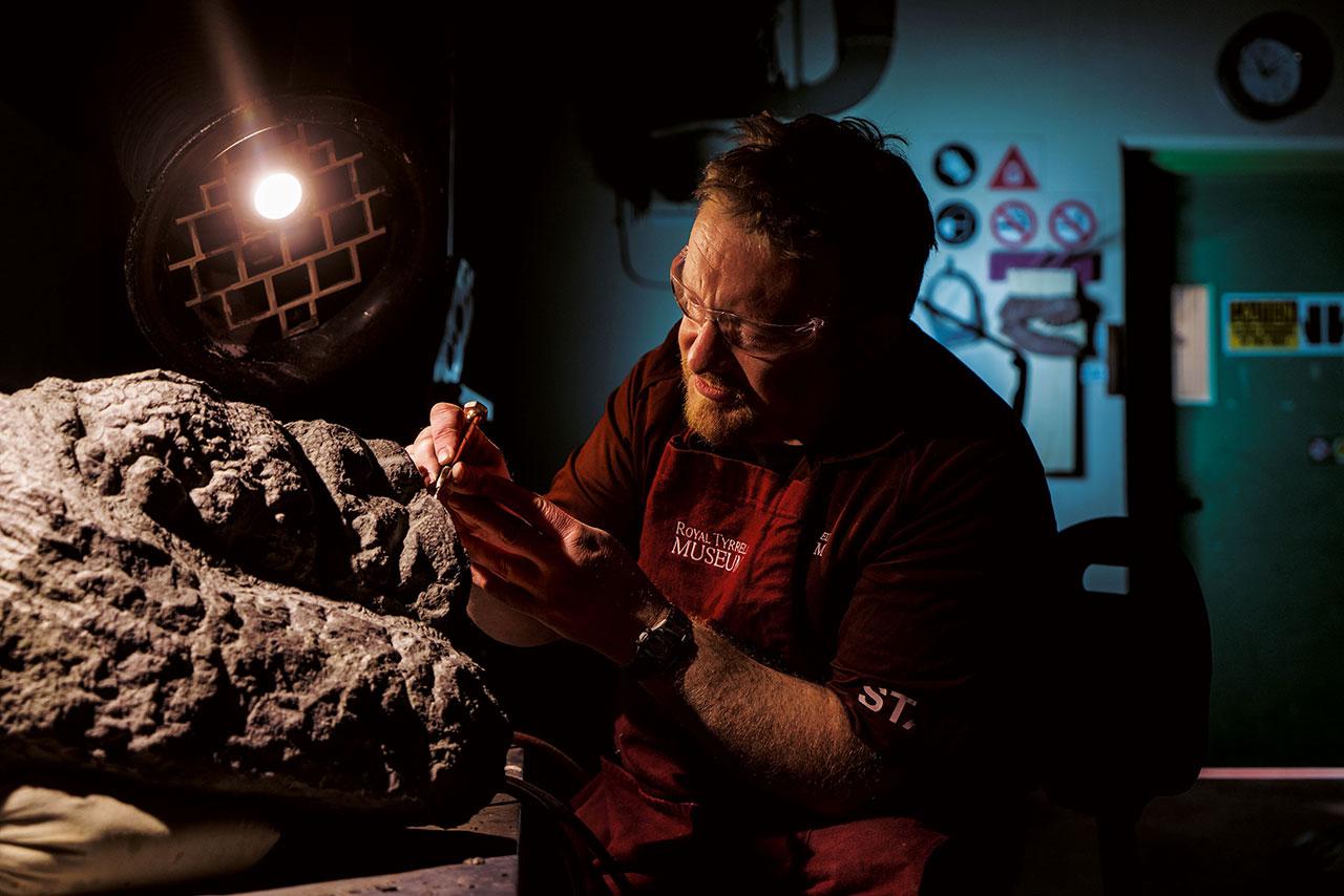 เกือบหกปีต่อมา ผมไปเยือนห้องปฏิบัติการเตรียมฟอสซิลที่พิพิธภัณฑ์รอยัลไทร์เรลล์ ซึ่งตั้งอยู่ในบริเวณภูมิประเทศแบดแลนด์ที่ลมพัดจัดของรัฐแอลเบอร์ตา ผมสนใจกองหินหนัก 1.1 ตันตรงมุมห้อง