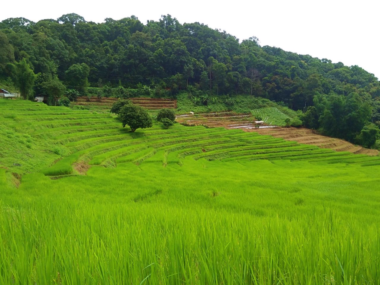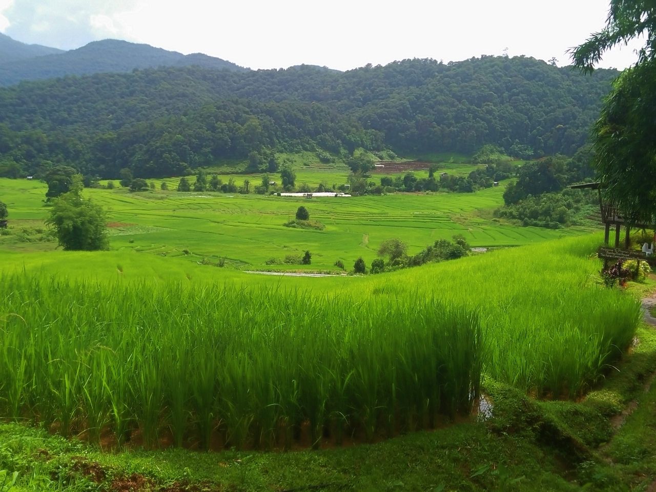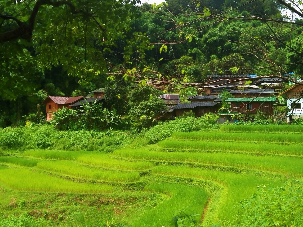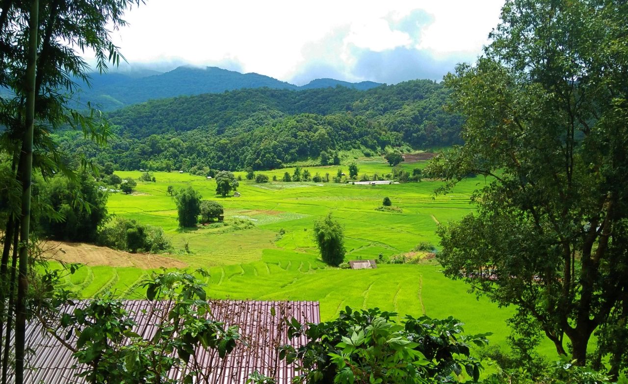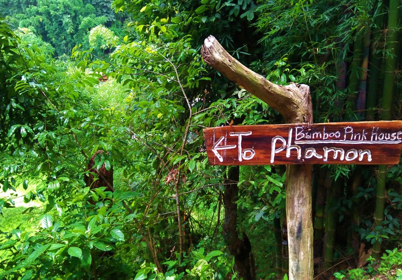 ระหว่างทางเดินขึ้นเขาก่อนที่จะถึง แบมบูพิงค์ เฮาส์ เรามองลงไปเห็นวิวนาข้าวขั้นบันไดอยู่ท่ามกลางหุบเขา วิวสวยอย่างที่ไม่เคยเห็นมาก่อน เดินไปเรื่อยๆ ก็จะมีบ้านของชาวบ้านให้เห็นประปราย ใช้เวลาเดินไม่นานก็เจอป้ายบอกทางไป แบมบูพิงค์ เฮาส์
