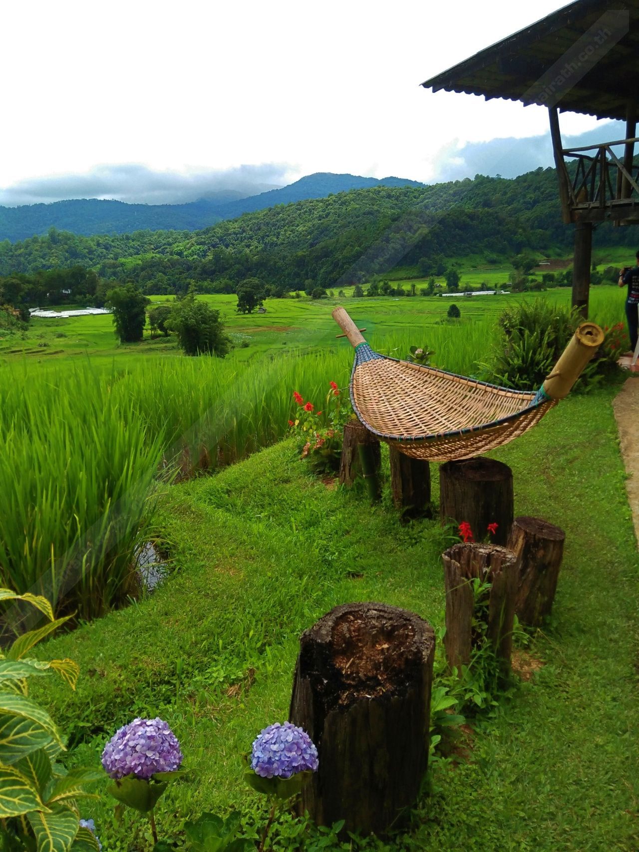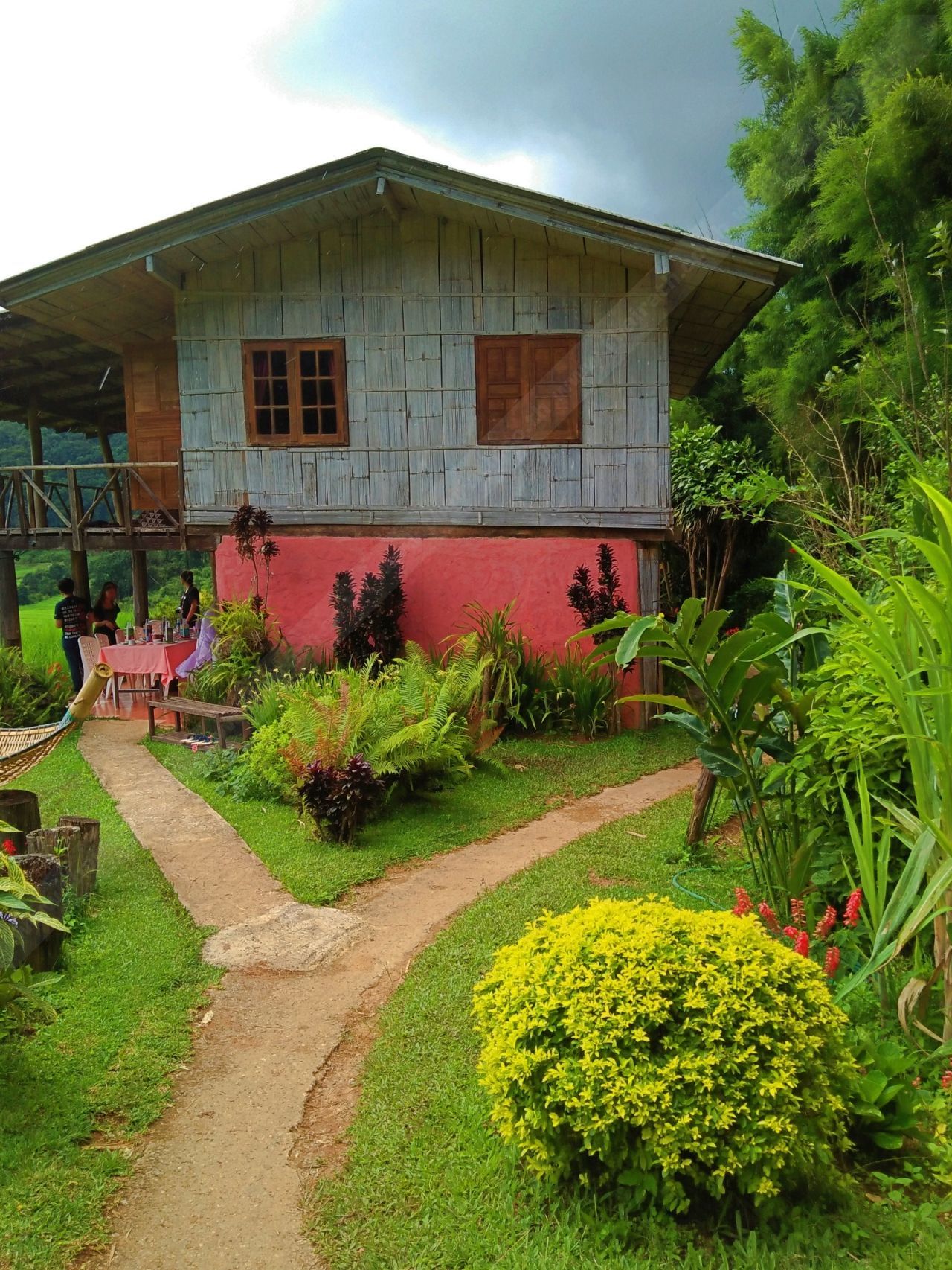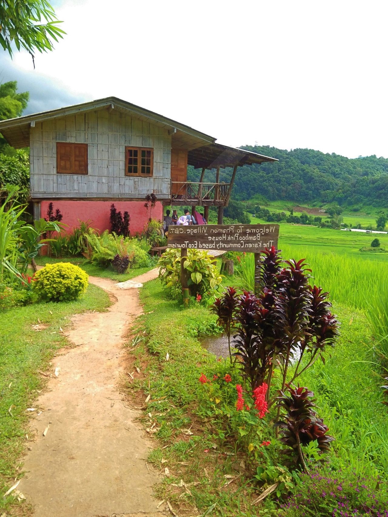 จากป้ายบอกทาง เราเดินลงทางลาดชันไปอีกนิด ก็พบกับบ้านสีชมพูหลังน้อยๆ รอต้อนรับ พร้อมกับป้ายที่เขียนว่า ยินดีต้อนรับสู่หมู่บ้านผาหมอน แบมบูพิงค์เฮาส์ รอบๆ ตัวบ้านถูกโอบล้อมไปด้วยดอกไม้นานาชนิด สามารถชมวิวทิวทัศน์และนาข้าวขั้นบันไดได้อย่างใกล้ชิด นี่แหละที่พักราคาถูก แต่ได้วิวหลักล้าน!