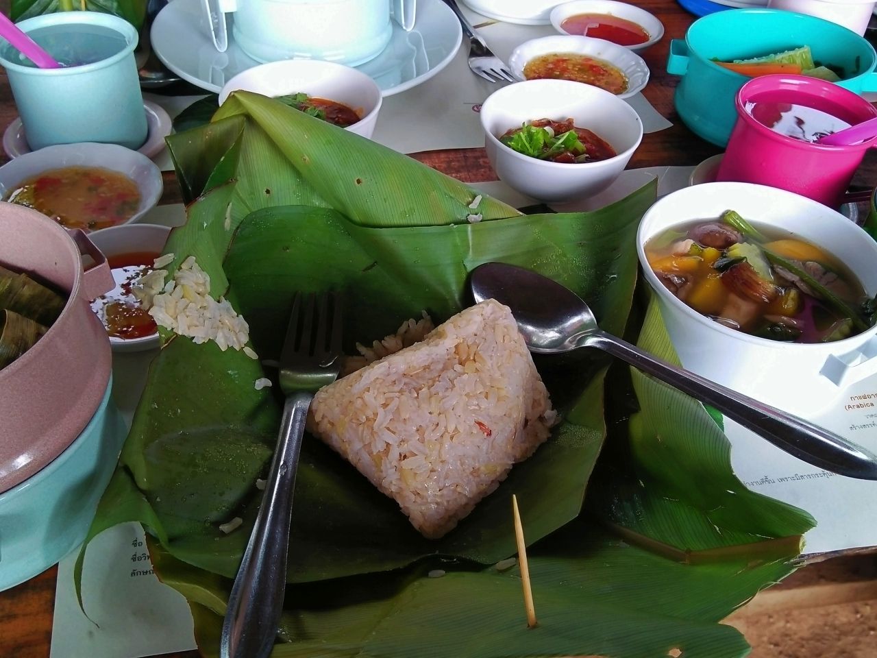 โดยข้าวของที่นี้จะเป็นข้าวกล้องดอยห่อด้วยใบไม้ ผักก็มีหลายประเภทมากๆ ที่สำคัญ สด สะอาด ปลอดภัย กับข้าวก็มีให้ชิมหลากหลายเมนูเช่นกัน เช่น ไก่อบ ปลาสเตอเจี้ยนย่างถ่าน แกงเลียง อะโวคาโดน้ำกะทิ เป็นต้น