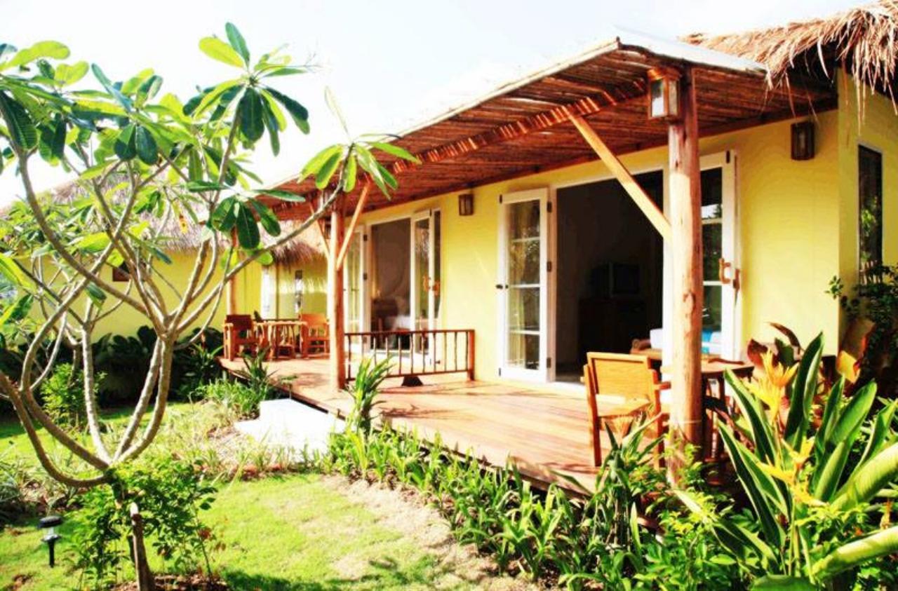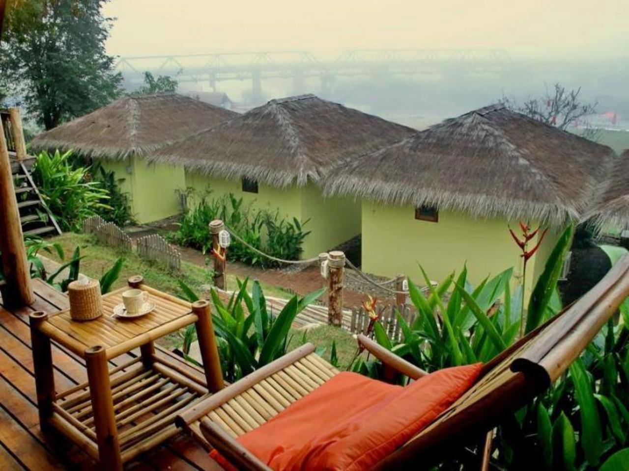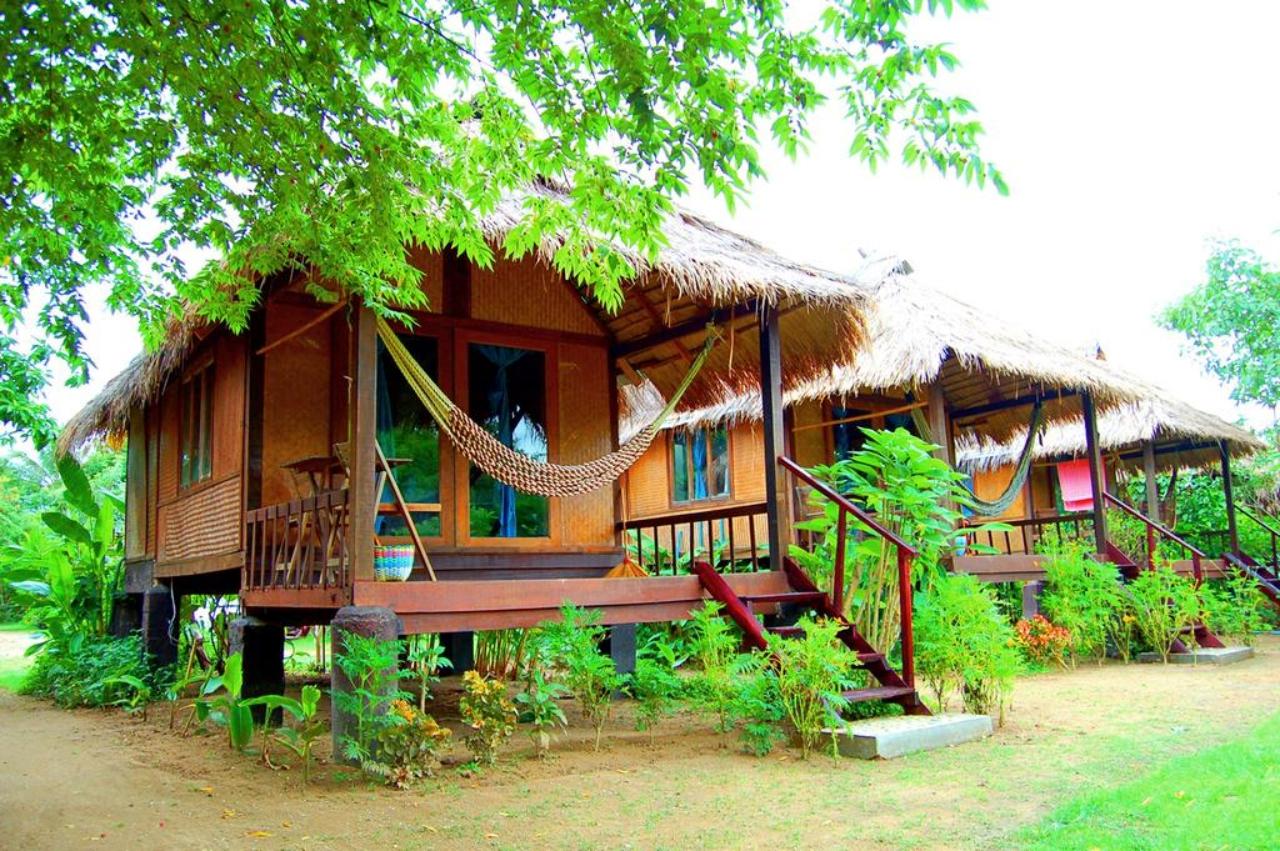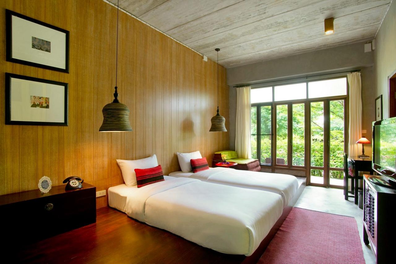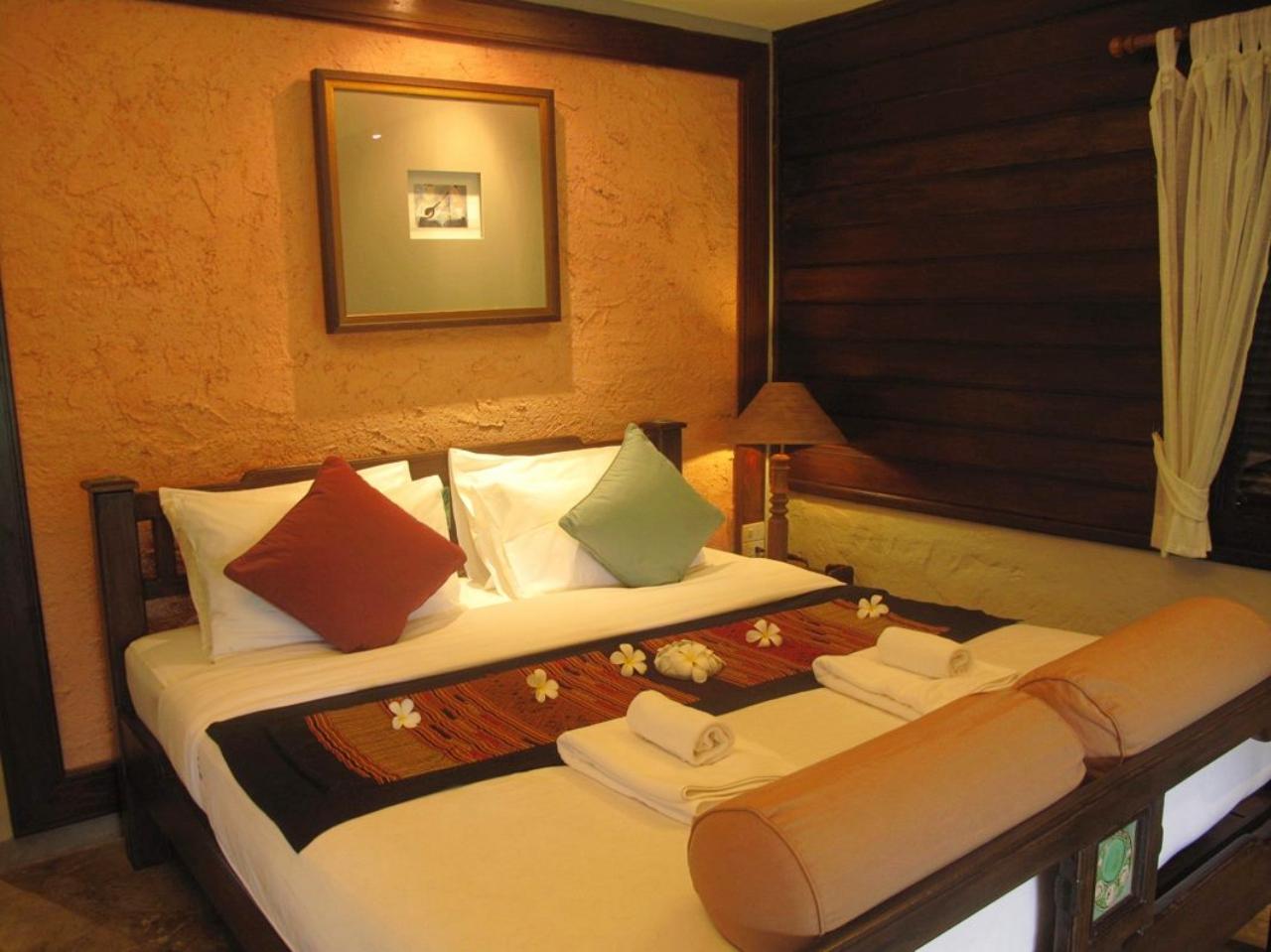 ห้องพักตกแต่งภายในด้วยไม้แบบเรียบง่าย พร้อมพัดลม ลานเฉลียง โทรทัศน์ ห้องน้ำในตัวพร้อมบริการน้ำอุ่น