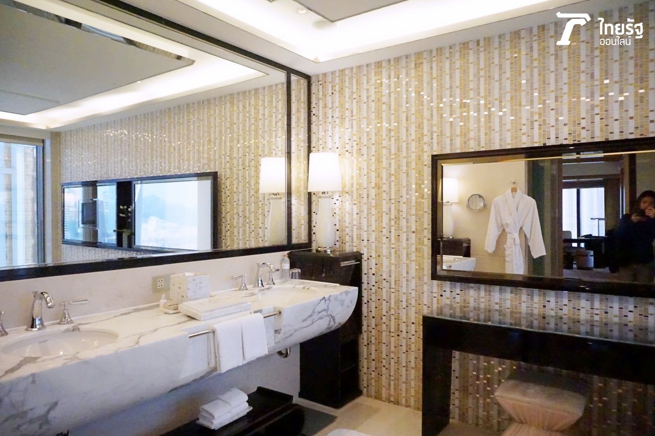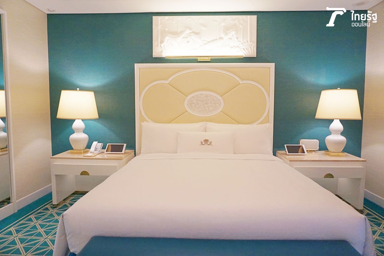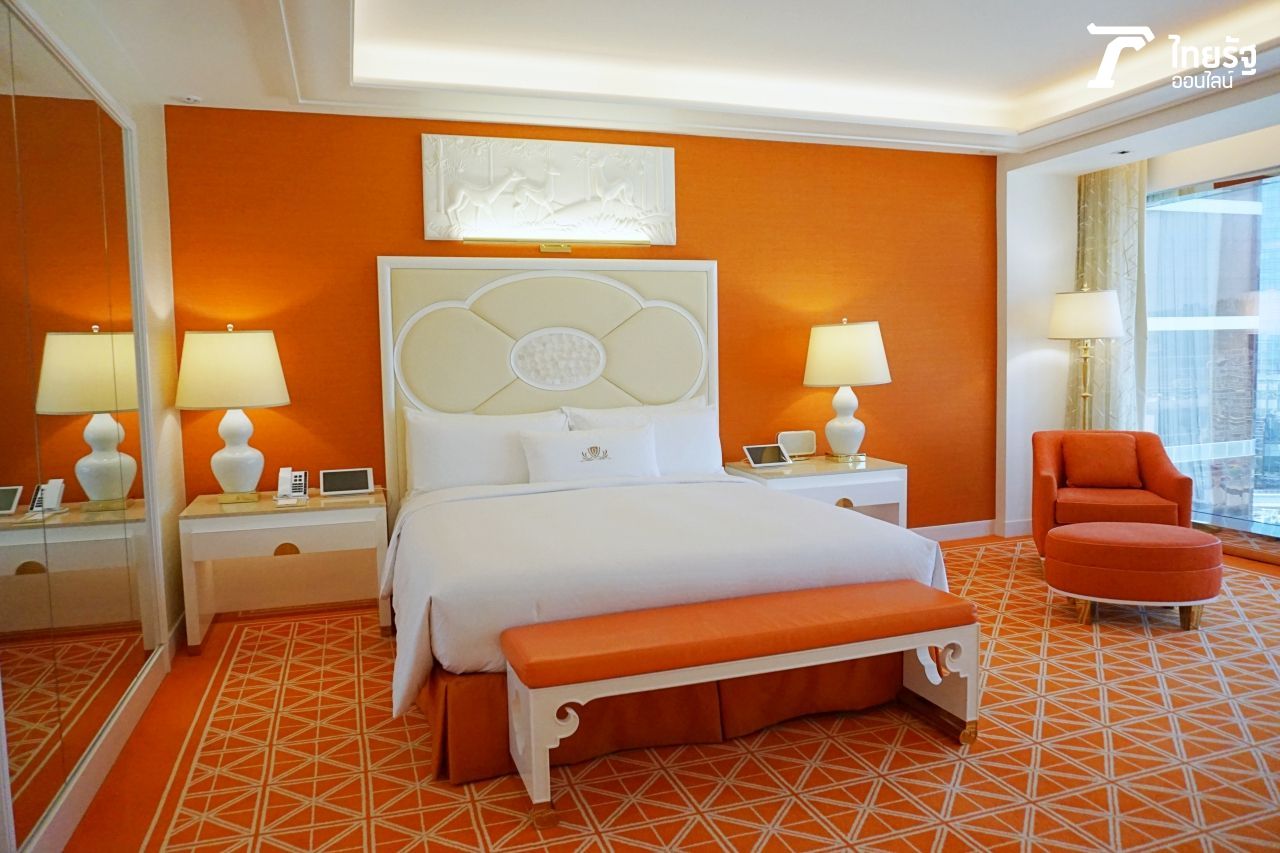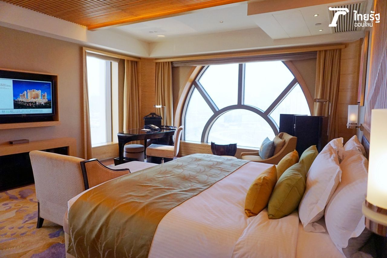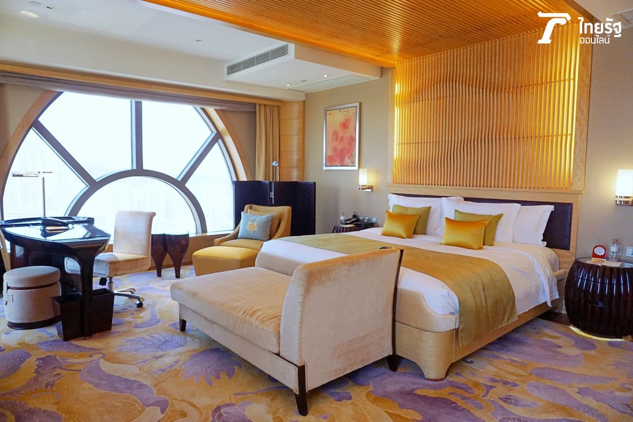 ห้องพักของที่นี่มีทั้งหมด 1,500 ห้อง แบ่งเป็นห้องสวีต 150 ห้อง ส่วนห้องที่อยากแนะนำคือ Premium Suites อยู่ที่ชั้น 27 และชั้น 33 ของโรงแรม ห้องกว้างขวาง เห็นวิวมุมสูงสวยงามมาก สนนราคาในวันธรรมดา และไม่ใช่หน้าเทศกาล ราคาแค่คืนละ 8,000 บาท อย่าเพิ่งบอกว่าแพง เพราะถ้าเปรียบเทียบห้องเกรดนี้ในเมืองไทย ราคาดีดขึ้นไปหมื่นกว่าบาทเลยทีเดียว