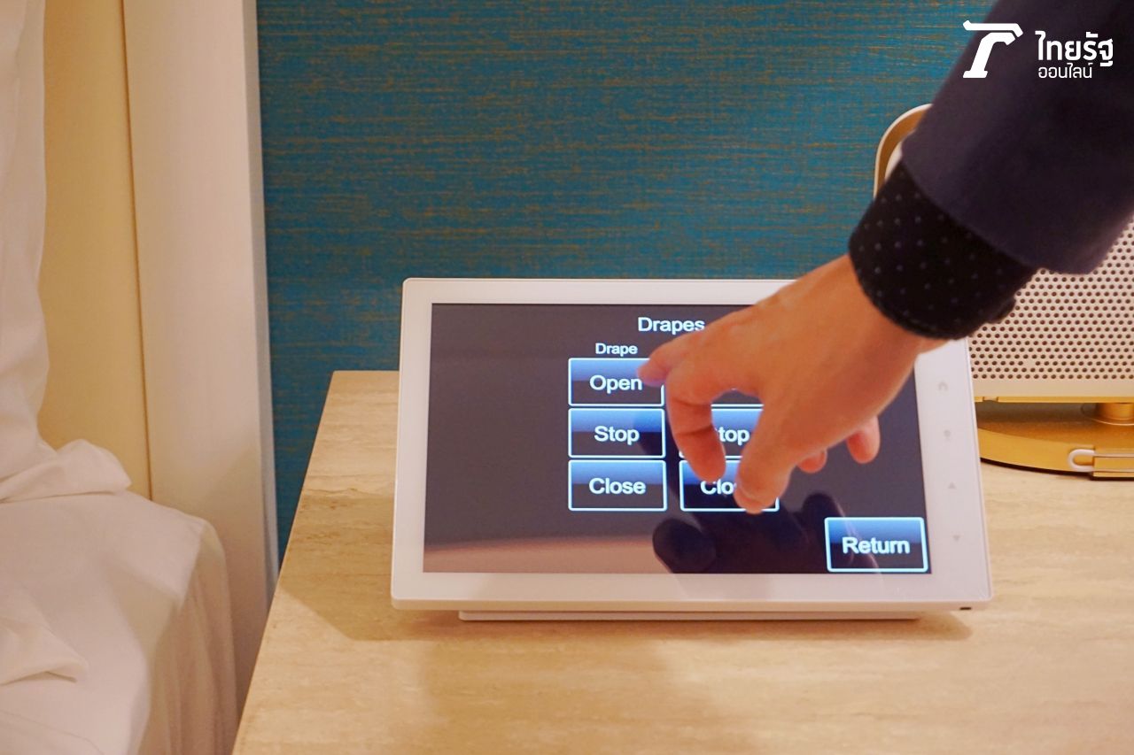 โรงแรมแห่งนี้เขาเน้นเรื่องการนำเทคโนโลยีสมัยใหม่มาให้บริการแขก ในห้องพักก็จะมีไอแพดแบบนี้ ให้แขกสามารถกดใช้งานต่างๆ ได้อย่างสะดวกสบาย ทั้งการเรียกแม่บ้าน การสั่งเปิดปิดประตู การสั่งเปิดปิดไฟตามจุดต่างๆ ในห้องพัก เป็นต้น