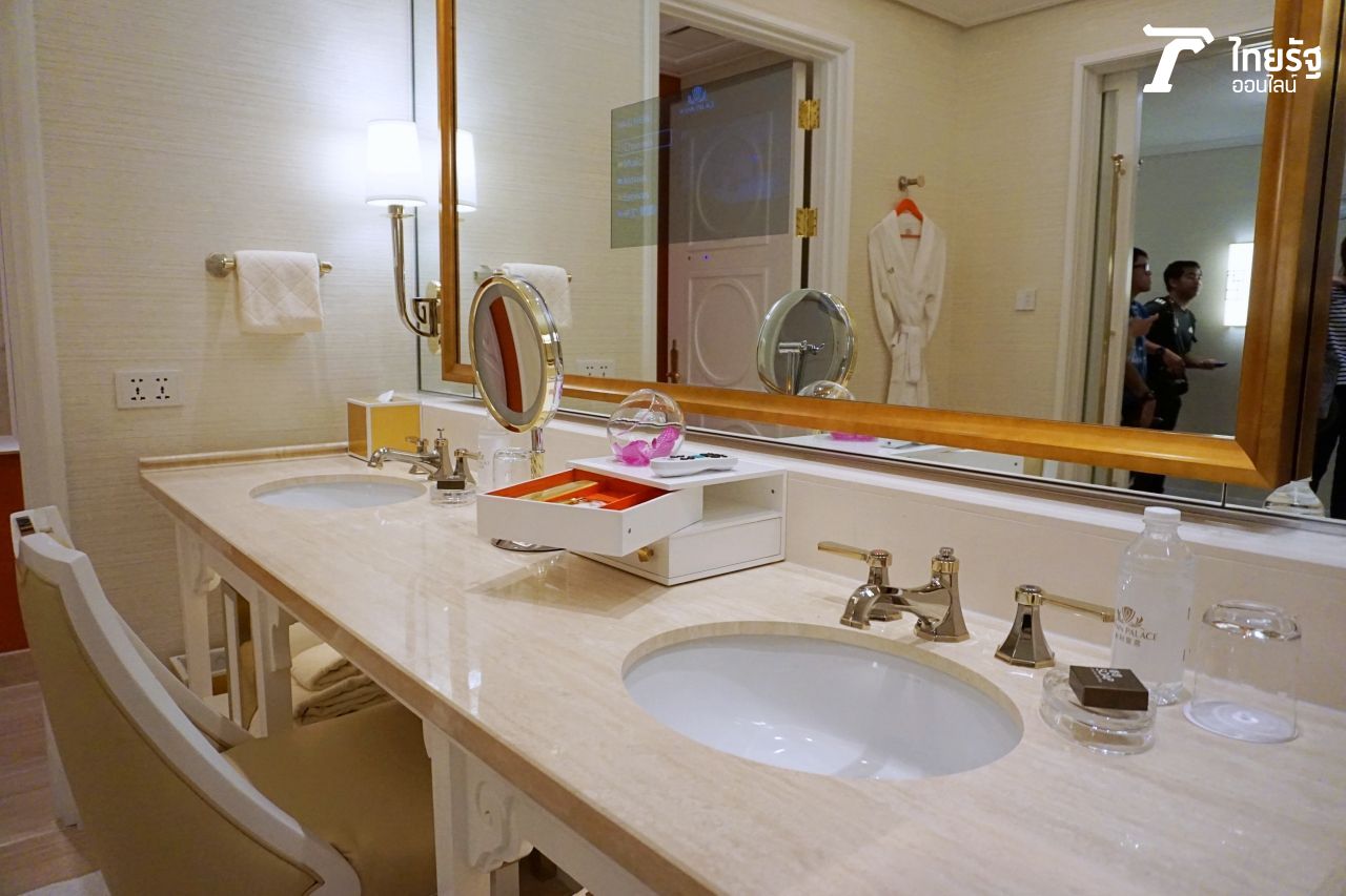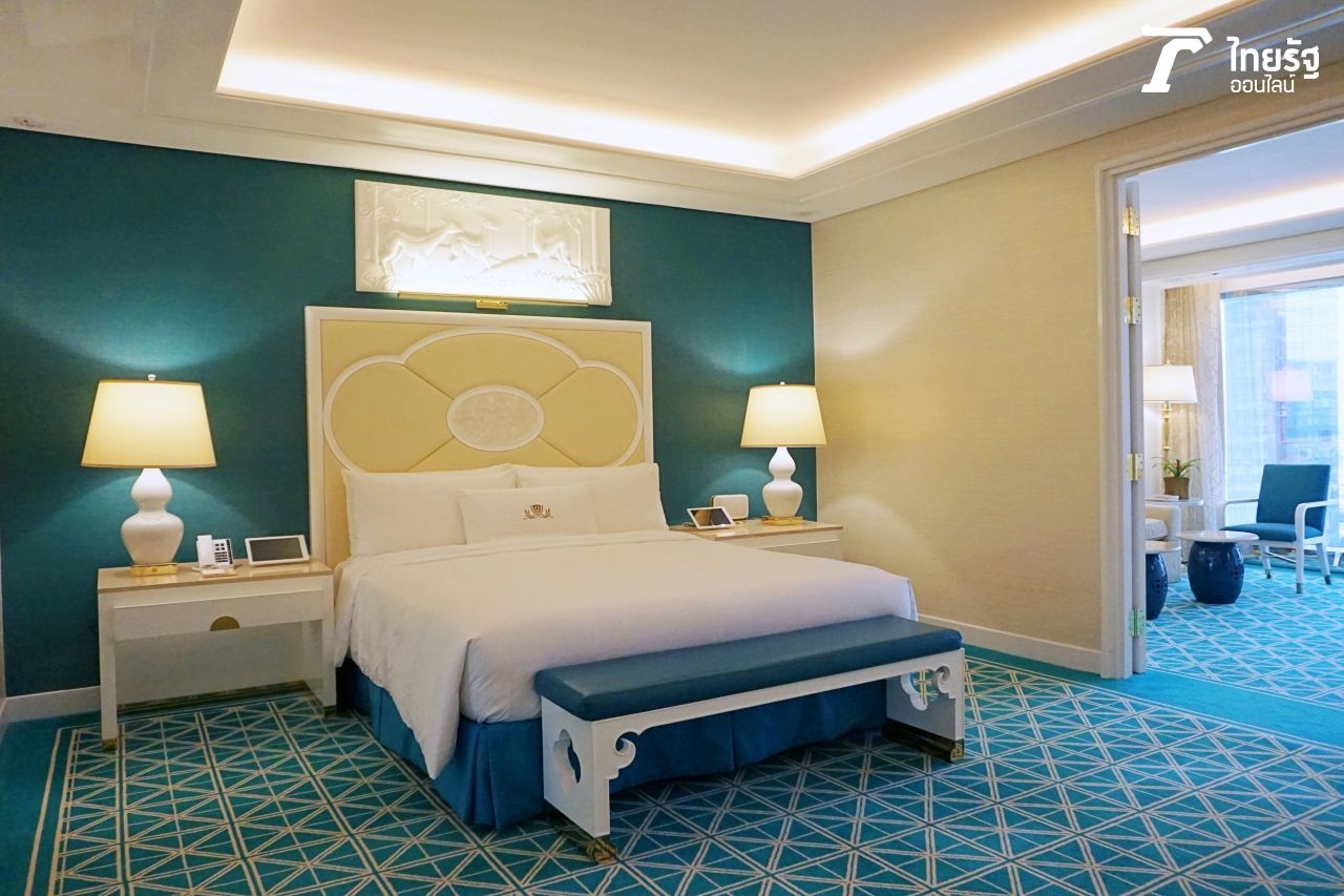 มาถึงห้องพักกันบ้าง ที่นี่มีห้องพักทั้งหมด 1,706 ห้อง แบ่งเป็นห้องสวีต 500 ห้อง เราเริ่มจากการชมห้องสวีตกันก่อนเลย (ห้องสีเขียวฟ้า) มีส่วนของห้องนอนและห้องรับแขกแยกกัน ห้องน้ำกว้างมากๆ เป็นห้องนอนอีกห้องยังได้