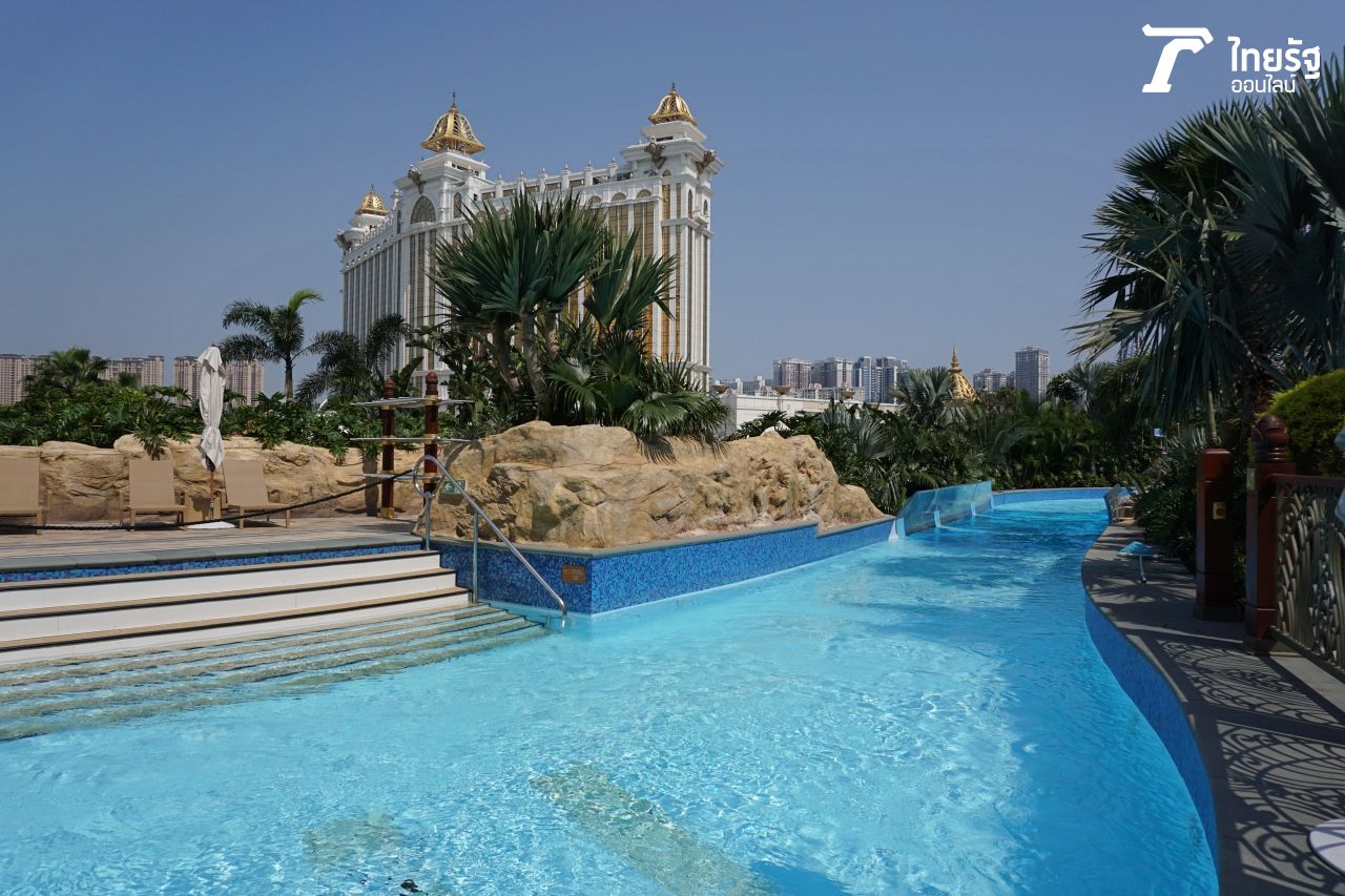 โรงแรมกาแล็กซี่ มาเก๊า เป็นโรงแรมที่ก่อตั้งมาตั้งแต่เดือนพฤษภาคม ปี 2011 โดดเด่นที่ภายในมีพื้นที่กว้างมากๆ และยังมีสวนน้ำในโรงแรมด้วย อารมณ์เหมือนสวนสยามบ้านเรา ไฮไลต์อยู่ตรงที่สามารถออกมาเล่นน้ำได้เลยทั้งวัน มีท่อสไลด์แบบหลอดแก้วใสๆ มองเห็นคนเล่นน้ำข้างในได้ด้วย คนที่เล่นเครื่องเล่นนี้สามารถลอยน้ำชมวิวโรงแรมไปได้ยาวๆ เลย