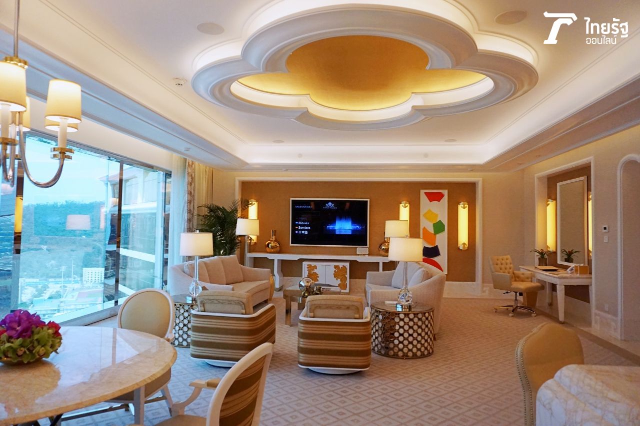 มาต่อกันที่ห้องแบบที่สาม คือ Fountain Salon Suite Room ห้องธีมสีทองอร่ามตา เป็นห้องสุดหรูระดับ 6-7 ดาว เข้าพักได้ 2 คน แต่มีพื้นที่ใช้สอยเยอะมาก ห้องกว้างขวางมากๆ สามารถจัดปาร์ตี้ได้ด้วย เหมาะกับการรองรับเพื่อนๆ ที่จะมาสังสรรค์กัน เป็นห้องที่วิวดีที่สุด มองเห็นสระน้ำพุ (ระบำน้ำพุ) ข้างล่างด้วย สนนราคา 28,000-30,000 บาท