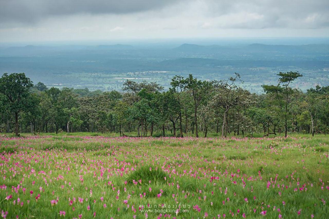 จากนั้นเป้าหมายต่อไปคือ อุทยานแห่งชาติไทรทอง ทุ่งบัวสวรรค์ เป็นอีกจุดชมดอกกระเจียวที่สวยมากๆ อีกที่ค่ะ 60 กิโลเมตรก็ถึง อ.หนองบัวระเหว อุทยานแห่งชาติไทรทอง ค่าเข้า 40 บาทเหมือนเดิม แต่ครั้งนี้เราต้องนั่งรถกระบะที่อุทยานเตรียมไว้ให้ ค่ารถคนละ 60 บาท เป็นคุณลุงชาวบ้านที่คอยขับรถส่ง เนื่องจากเส้นทางมีลุยผ่านน้ำตกด้วย คุณลุงคนขับรถบอกว่า ต้องเดินไปให้ถึงทุ่งที่ 1 นะ ตรงนั้นสวยมากๆ ไกลไหมลุง 2 กิโลเมตรเอง ห๊ะ!!! ไหนๆ ก็ไหนๆ ละ ลุยสิจ๊ะ สายมากแล้ว เรายังเจอหมอกอยู่เลย อากาศก็เย็นสบาย เดินมาเรื่อยๆ และเราก็ไม่ผิดหวัง ได้เจอกับความอลังการของดอกกระเจียว สีสวยชูบานสะพรั่งเต็มทุ่งไปหมด ยื่นสตั๊นอยู่สักพักเพราะไม่รู้จะถ่ายมุมไหน มองไปทางไหนก็สวยไปหมด คุ้มค่ามากกับการเดินมาไกล และเราก็ไม่ลืมที่จะเก็บภาพสวยๆ มาฝากเพื่อนๆ แฟนๆ แบกกล้องเที่ยวอีกเช่นเคย เดินกลับเส้นทางเดิมเราแวะที่จุดชมวิว ผาหำหด ฟ้าเป็นใจเปิดมาให้เราได้เก็บรูปสวยๆ ด้วย รถจะจอดรอให้เราขึ้นได้เลยไม่เสียค่าบริการแล้ว เค้าจะมาส่งที่จุดจอดรถด้านล่างเลยจ้า