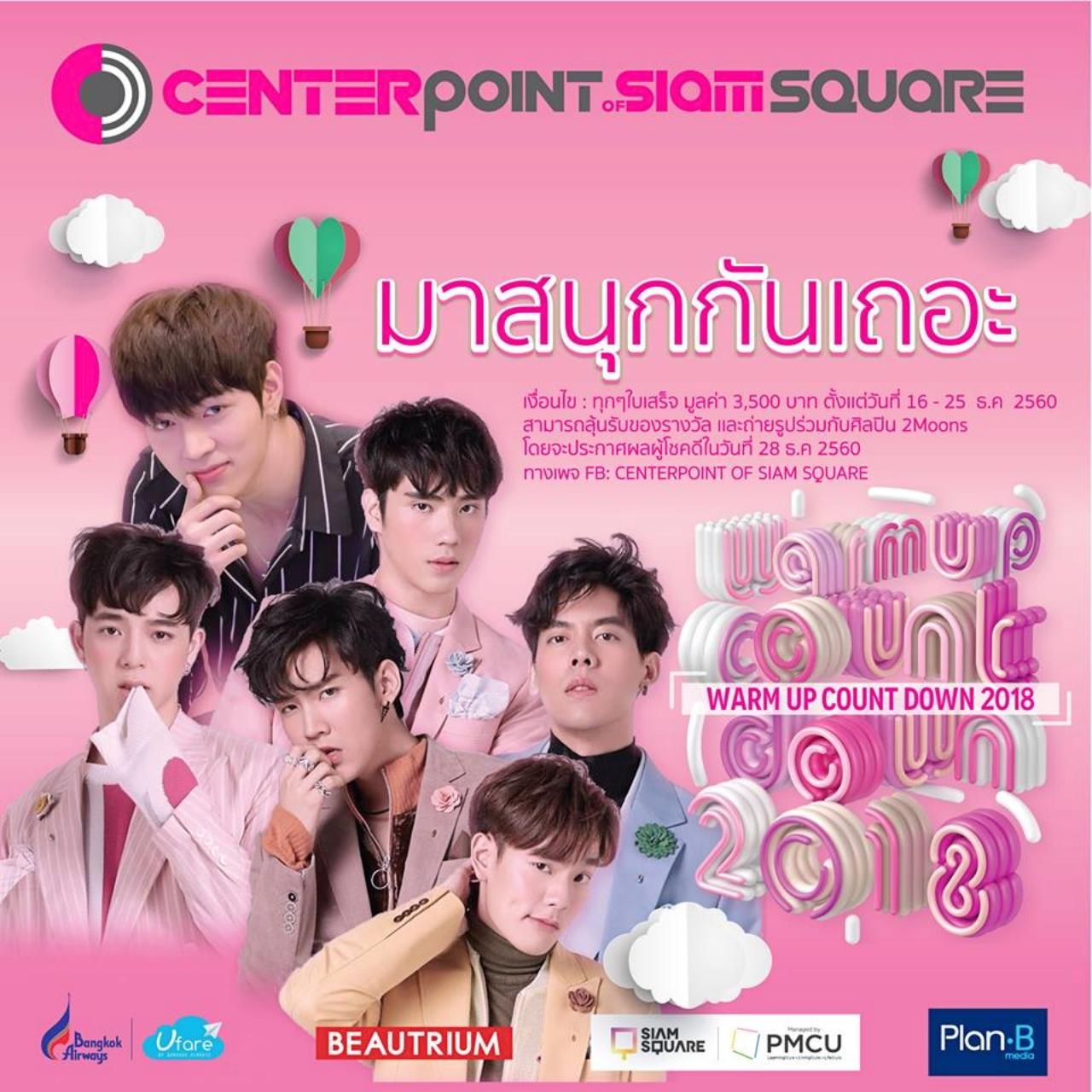 วันที่ 31 ธันวาคม 2560 ชวนร่วมอุ่นเครื่องเคาต์ดาวน์ต้อนรับปี 2018 ครั้งแรกในไทย กับเทศกาลความบันเทิงที่สุดแห่งปีของชาวสยามสแควร์ ในงาน ‘Warm Up Countdown Party 2018’ งานเดียวที่รวมศิลปินชื่อดังมาให้ได้มันส์กันแบบ non-stop ตั้งแต่เวลา 11.00-20.00 น. ณ ลานด้านหน้าศูนย์การค้าเซ็นเตอร์พอยท์ ออฟ สยามสแควร์ ฝั่งสยามสแควร์