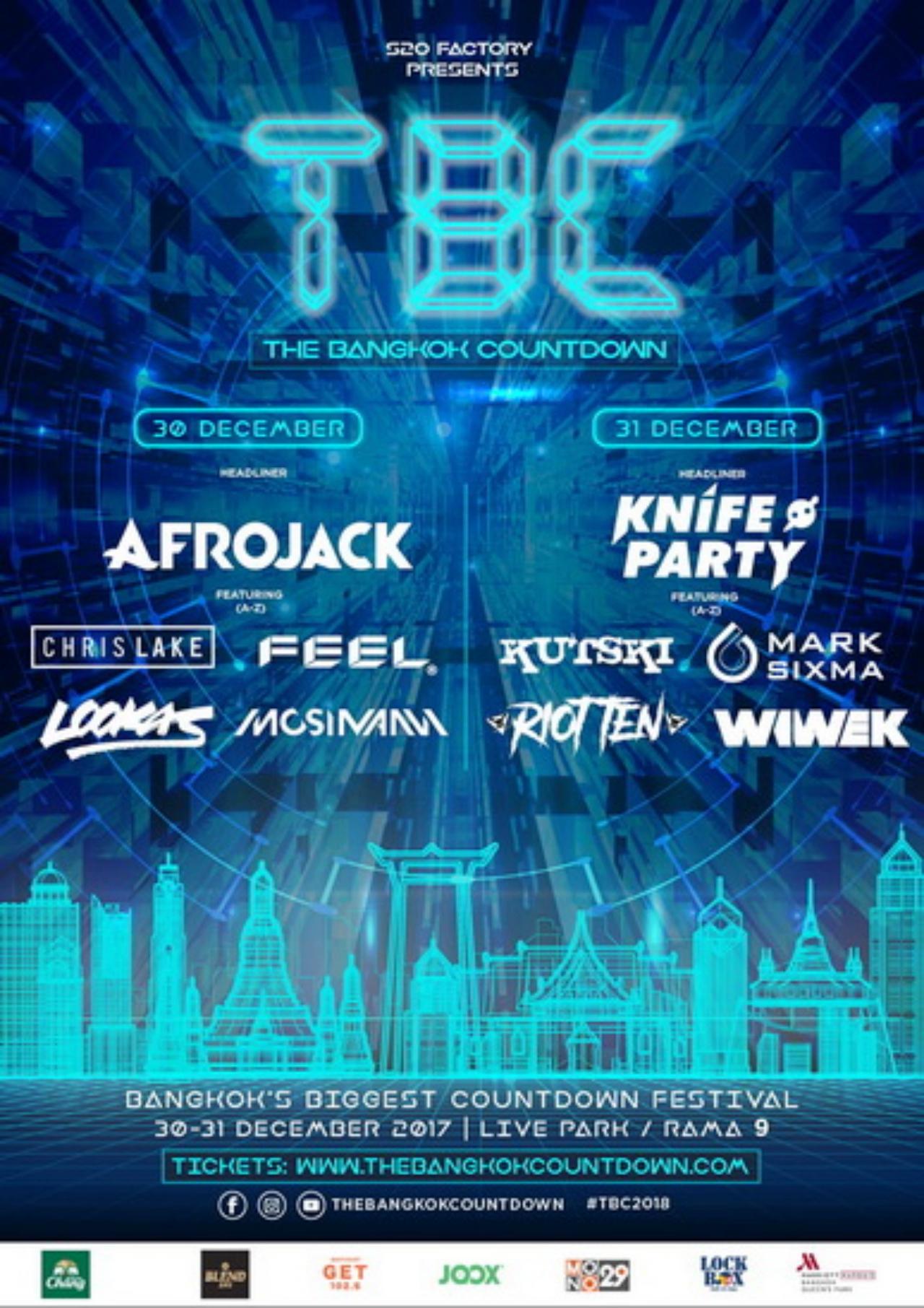 วันที่ 30-31 ธันวาคม 2560 มาระเบิดความมันแบบคูลๆ ส่งท้ายปีเก่าต้อนรับปีใหม่อย่างมีสไตล์กับ TBC ในงาน ‘THE BANGKOK COUNTDOWN FESTIVAL’ ณ Live Park ถนนพระรามเก้า รวบรวมกองทัพดีเจ EDM ชื่อดังระดับโลกมากที่สุดเท่าที่เคยมีมารวมกว่า 10 ชีวิต เช่น