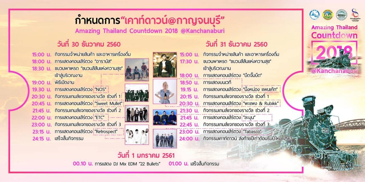 - Amazing Thailand Countdown 2018 @กาญจนบุรี จัดกิจกรรมที่สะพานข้ามแม่น้ำแคว นับเป็นครั้งแรกของจังหวัดกาญจนบุรีที่จัดกิจกรรมส่งท้ายปีเก่า ต้อนรับปีใหม่ ที่สะพานข้ามแม่น้ำแคว ชมการประดับไฟที่สวยงามตระการตาที่สะพานข้ามแม่น้ำแคว