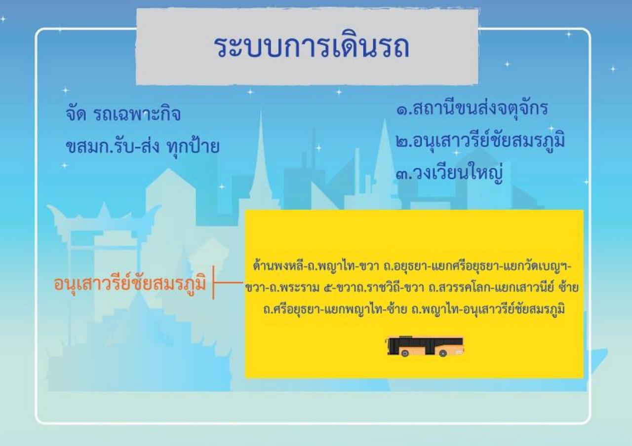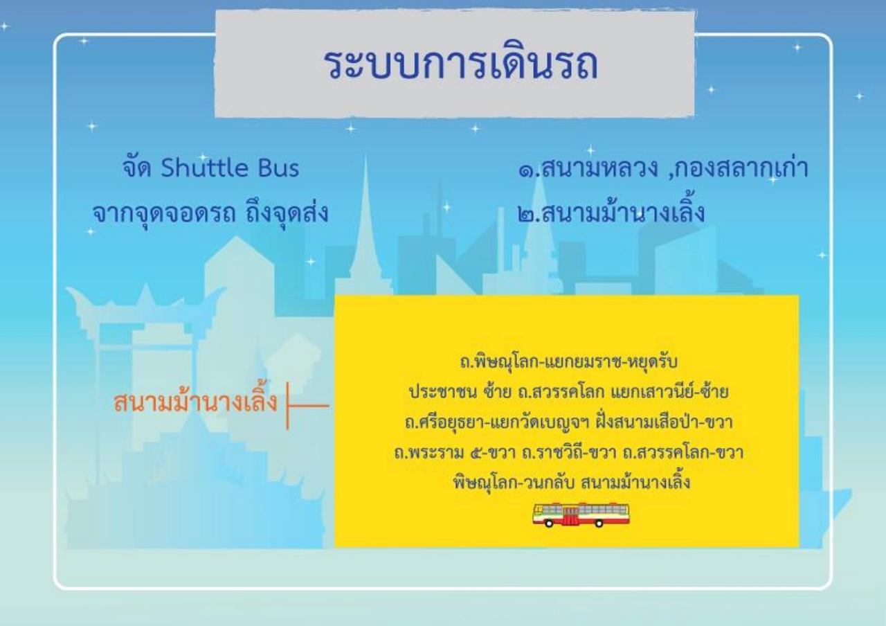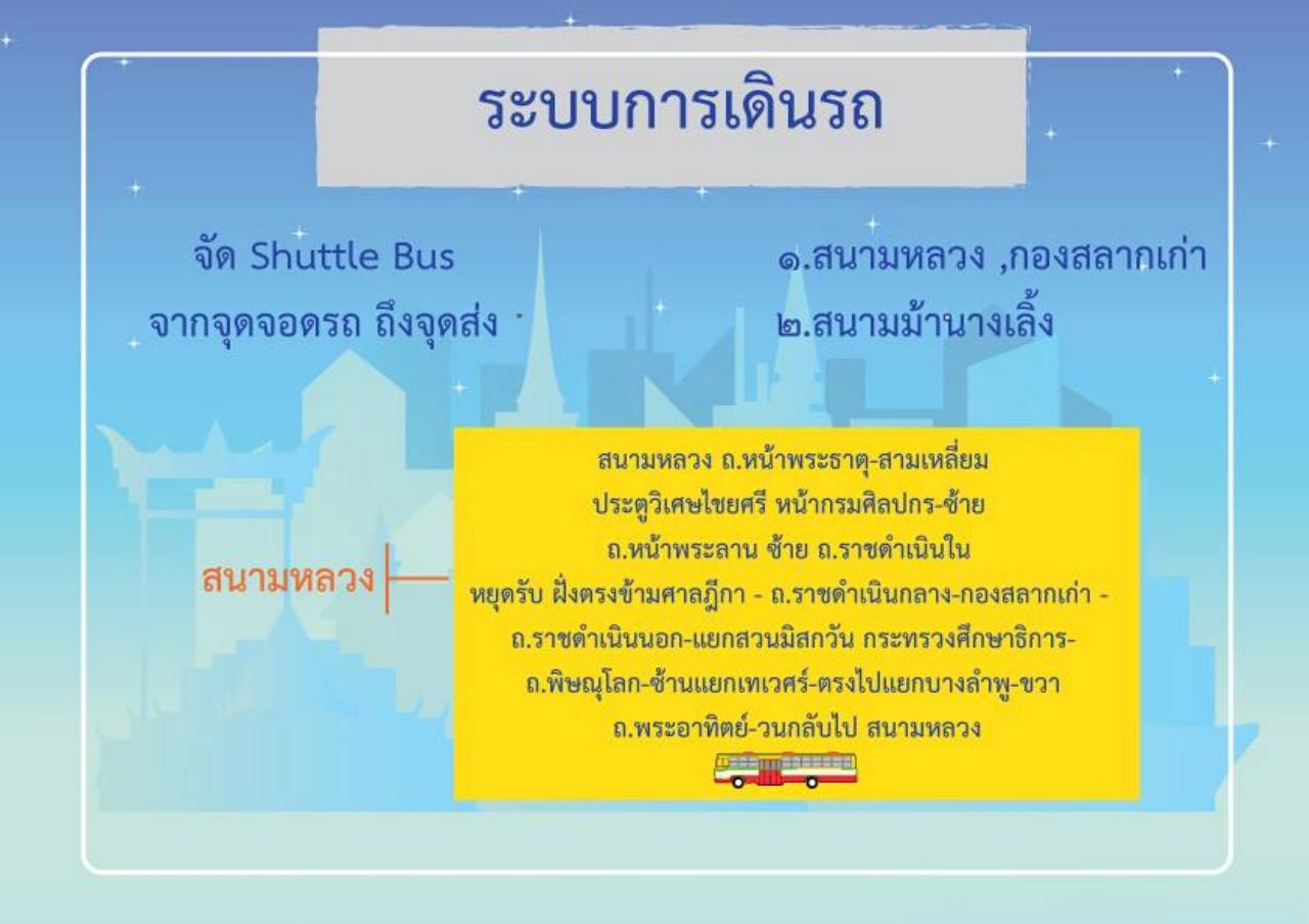 ทางเจ้าหน้าที่ผู้จัดงาน ได้จัดรถชัตเติลบัสไว้บริการประชาชนตามจุดต่างๆ ดังนี้