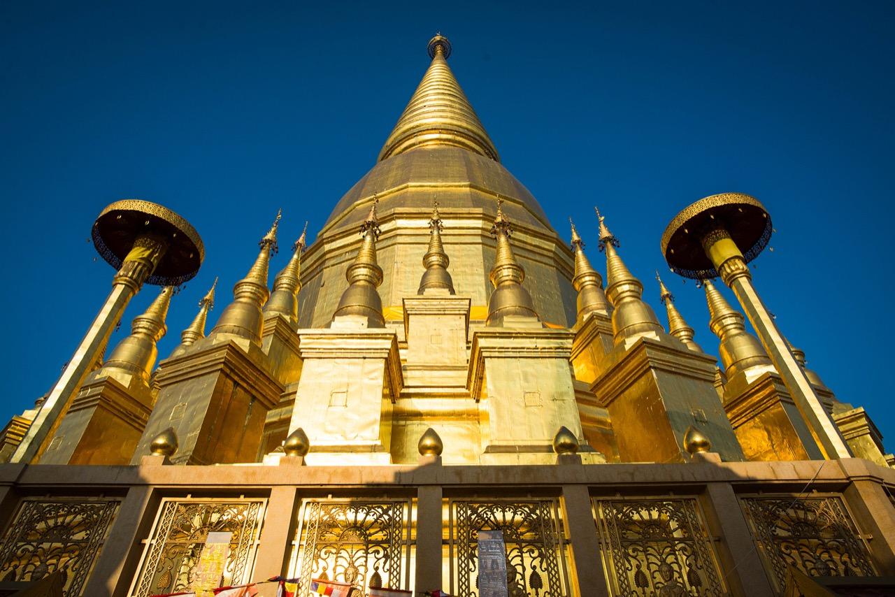 มหาธาตุเจดีย์ศรีเวียงชัย คล้ายชเวดากอง จำลอง เป็นสถาปัตยกรรมทางพระพุทธศาสนาศิลปะล้านนาที่สร้างด้วยศิลาแลงทั้งองค์ มีขนาดใหญ่ที่สุดในประเทศไทย ฐานกว้าง 40 x 40 หรือเท่ากับ 1 ไร่ ส่วนสูงจากบัวยอดฉัตรลงมาถึงพื้นยาว 64.39 เมตร ผู้ริเริ่มให้มีการออกแบบและการสร้างคือ หลวงปู่ครูบาชัยยะวงศาพัฒนา เพื่อให้เป็นพุทธเจดีย์ของพระพุทธเจ้า 5 พระองค์อันจะเป็นพุทธเจดีย์ของภัทรกัปให้ลูกหลานคนไทยได้กราบไหว้เป็นแห่งแรกของประเทศไทยและเป็นแห่งที่สองของโลก เริ่มสร้างเมื่อปี พ.ศ. 2538