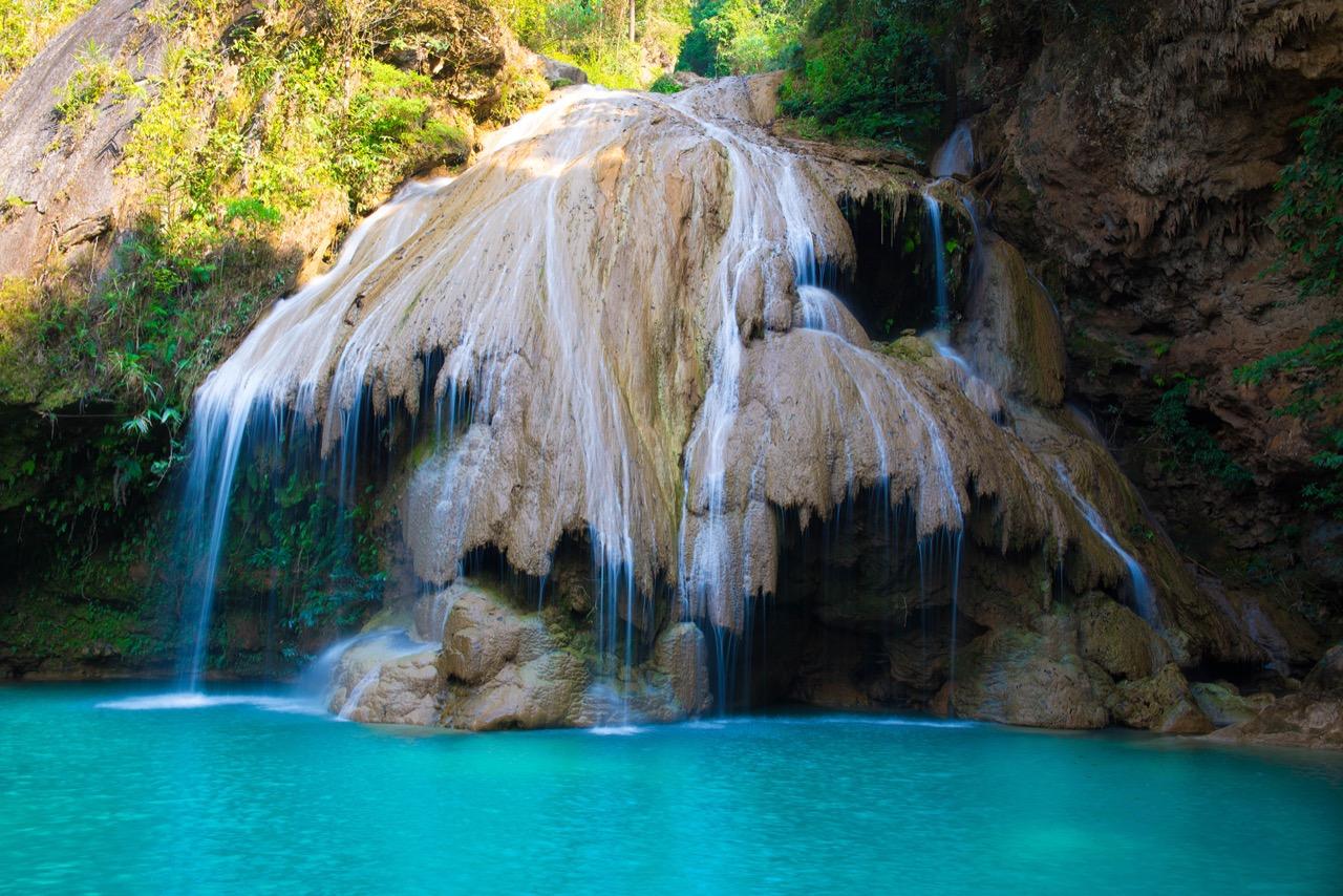 น้ำตกก้อหลวง จะมีลักษณะเป็นน้ำตกหินปูน ในช่วงฤดูหนาวสีของน้ำตกจะเป็นสีเขียวมรกต ส่วนในช่วงฤดูร้อนน้ำจะเป็นสีฟ้าคราม นักท่องเที่ยวสามารถลงเล่นน้ำได้ แต่จะต้องใส่เสื้อชูชีพของอุทยานฯ ที่มีให้บริการเช่า ราคา 20 บาท เนื่องจากจุดที่ลึกที่สุด มีความลึกถึง 8 เมตร อาจเป็นอันตรายได้