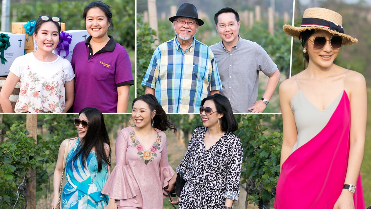 ณิชชา บุณยากร, ณชา จึงกานต์กุล, ม.ล. อธิฉัตร ฉัตรชัย และ นิกกี้ โลหิตนาวี ผู้บริหารไร่องุ่นไวน์กราน-มอนเต้ และครอบครัวให้การต้อนรับ