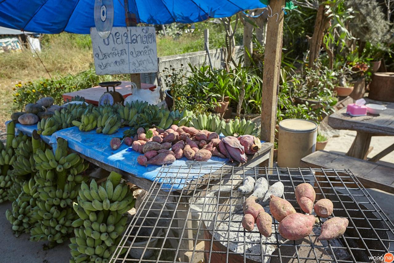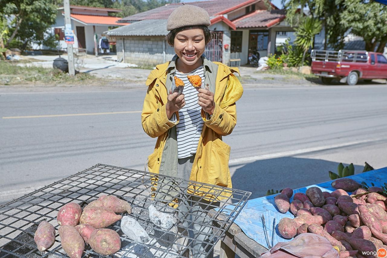 ปั่นจักรยานเล่นชมวิวบนเขายายเที่ยงอยู่สักพักก็ลงมาหาอะไรร้อน ๆ ทานซะหน่อยค่ะ ตอนขับผ่านทางขึ้นเขาแอบเห็นร้านขายมันเผา ก็เลยกลับไปซื้อทาน 3 หัว 20 บาท หัวใหญ่ ๆ เผาร้อน ๆ เลย