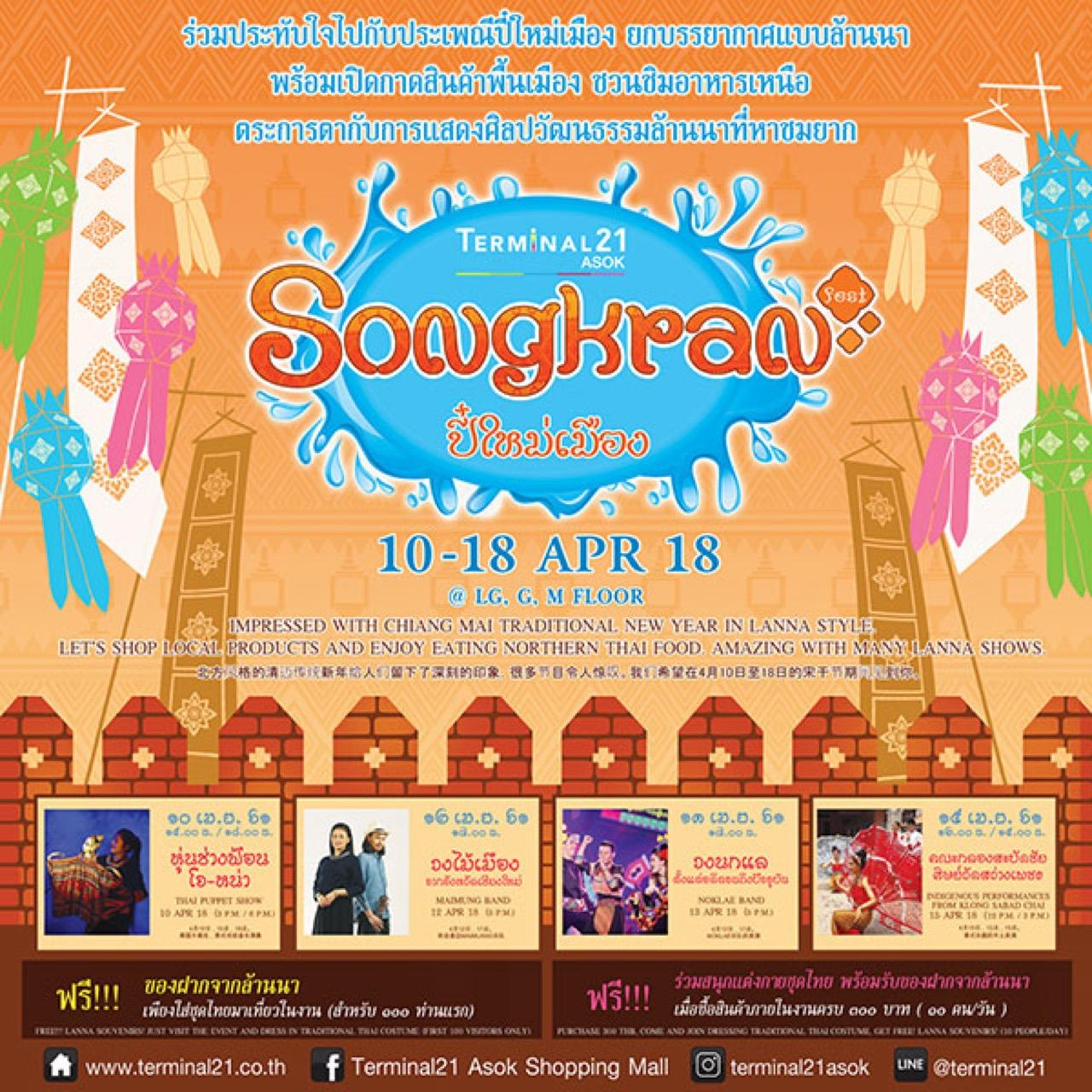 อีกหนึ่งห้างดังใจกลางอโศกอย่าง Terminal21 ก็ไม่น้อยหน้า มาในธีมล้านนาที่ให้ความรู้สึกสงกรานต์แบบชาวเหนือ ได้กลิ่นอายความเป็นวัฒนธรรมล้านนาแบบโบราณ ที่สำคัญมีอาหารและโชว์ที่หาดูยากมาจัดแสดงให้ได้ดูกันถึงที่ อีกทั้งภายในงานยังมีกิจกรรมอีกมากมายให้ได้ร่วมสนุก หากใครพลาดงานนี้ก็ต้องเสียดายที่สุดไปเลย