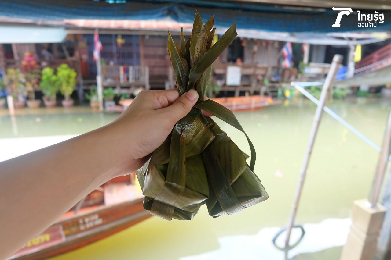 สำหรับเราเอง ได้ลองแวะซื้อขนมสอดไส่หรือขนมใส่ไส้จากคุณยายที่พายเรือมาขาย เป็นขนมโบราณห่อใบตอง ที่หาซื้อกินยากเหมือนกัน ตัวแป้งขาวนุ่มและมีไส้หวานข้างใน ทำจากมะพร้าวขูดและน้ำตาล อร่อยสุดๆ