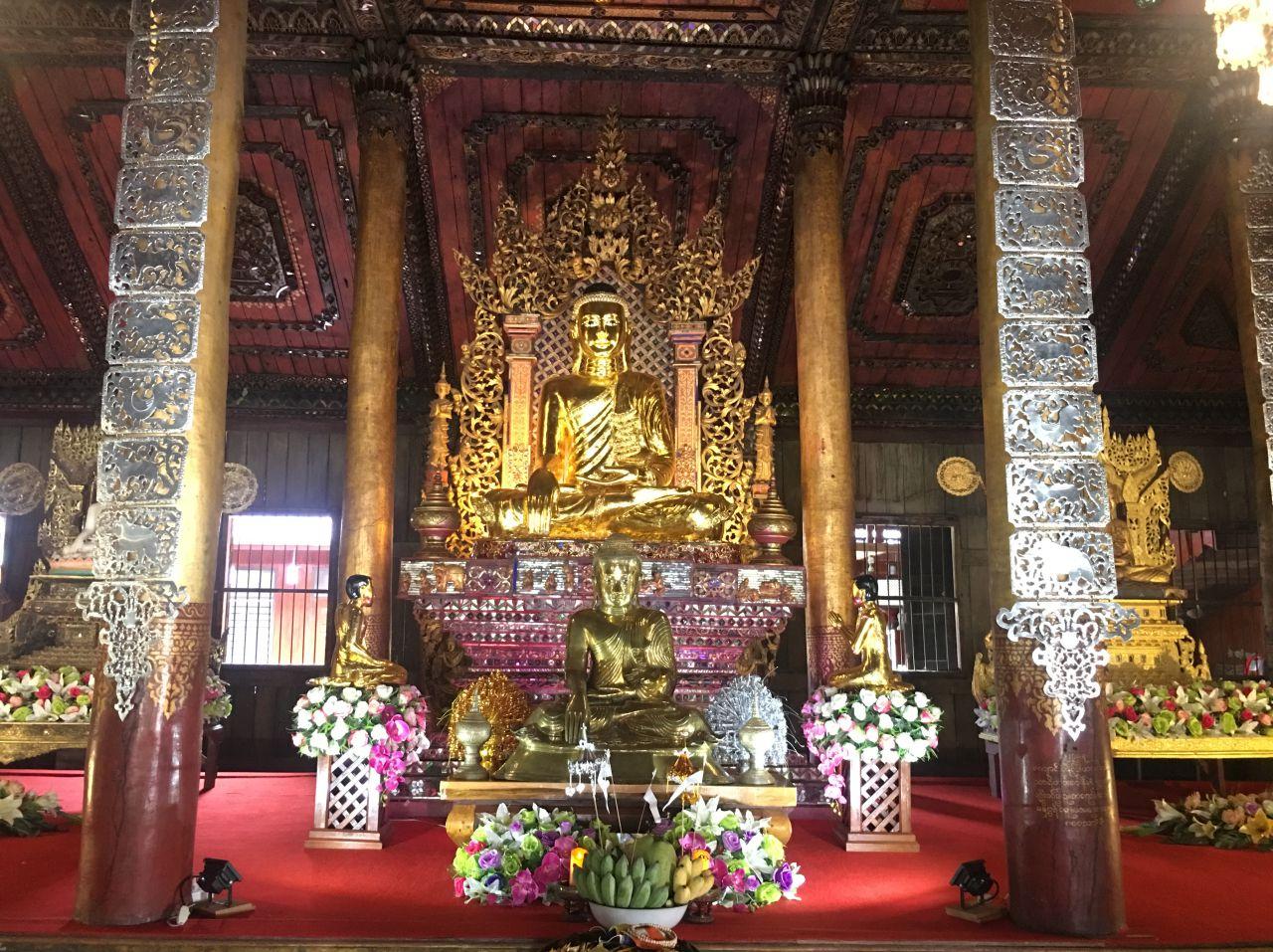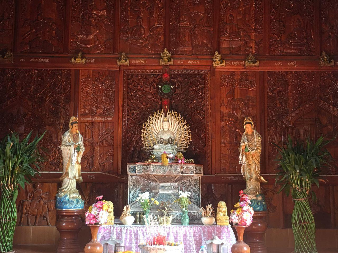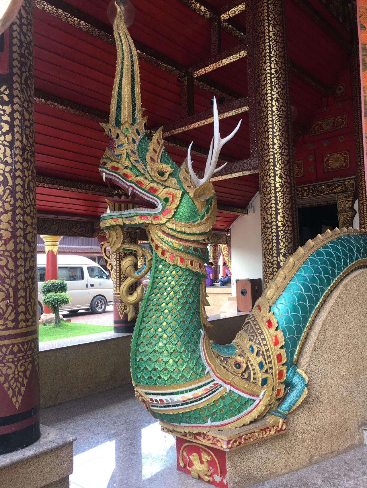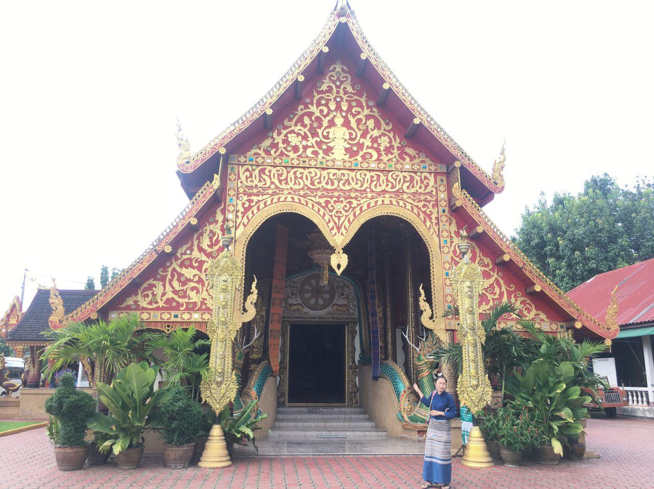 โดยบานประตูทำด้วยไม้แกะสลักทุกบาน ประตูเข้าสู่พระวิหารทำเป็นสามมุข มุขแต่ละทิศทำเป็นสัตว์ 3 ชนิด เชื่อว่าเพื่อช่วยปกป้องคุ้มครองพระศาสนา ได้แก่ พญานาค เสือ และสิงห์ โดยที่รูปปั้นพญานาคจะมี "เขากวาง" ประดับด้วย อันนี้แปลกมากๆ ซึ่งแตกต่างจากวัดแบบไทลื้ออื่นๆ ภายในมีจิตรกรรมฝาผนังเกี่ยวกับวิถีชีวิตชาวไทลื้อ และพระประธานเป็นพระพุทธรูปสมัยเชียงแสน นอกจากนี้ภายในวัดยังมีหอพิพิธภัณฑสถานด้วย ไปเที่ยวชมและกราบพระกันจ้า