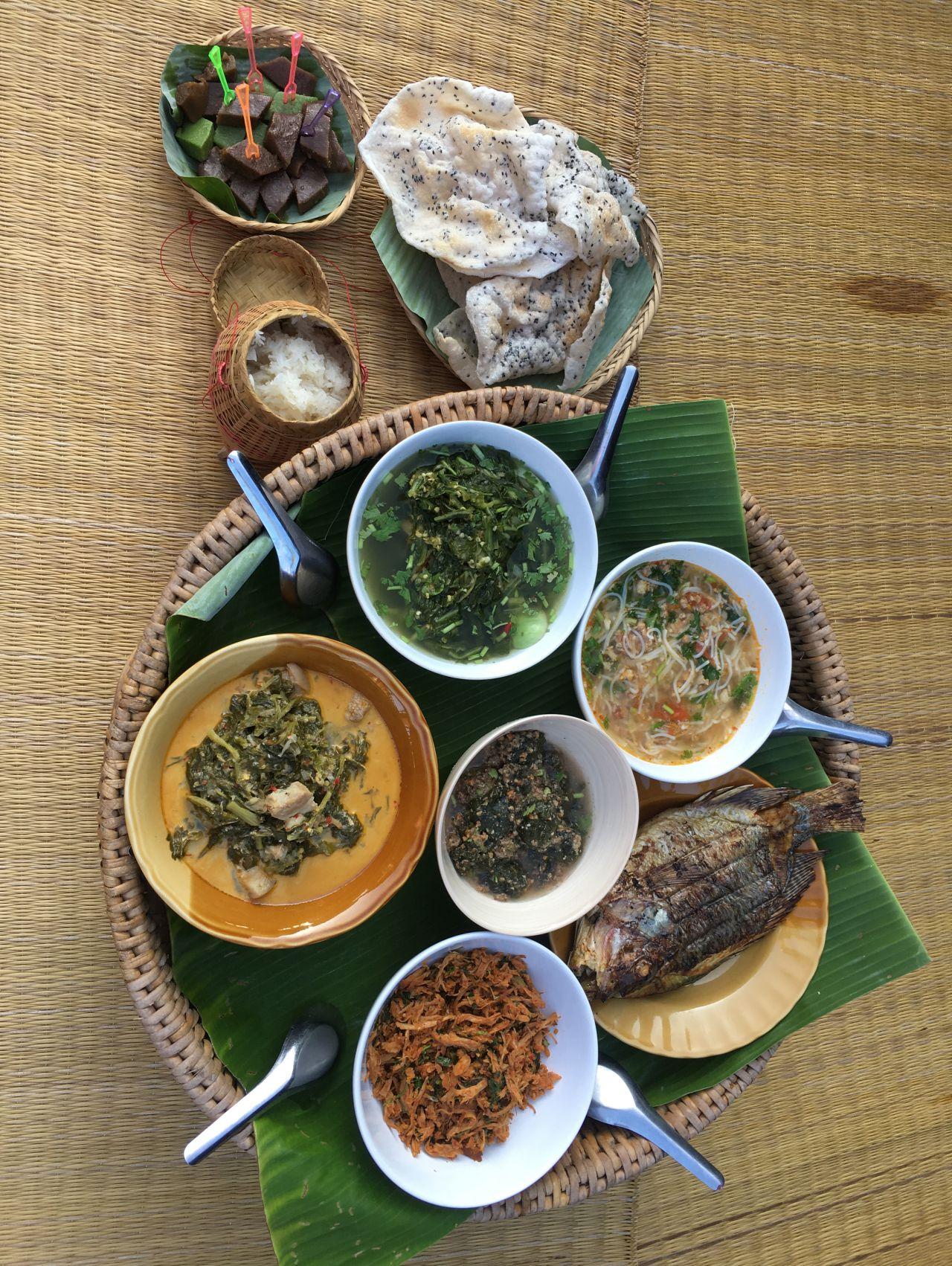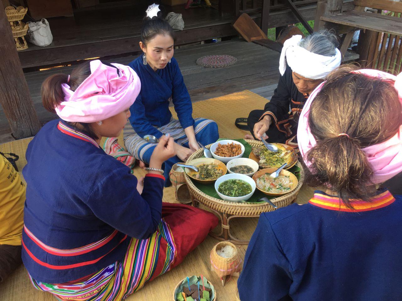ที่นี่มีดีที่ขันโตก เราได้รับประทานอาหารดั้งเดิมของคนไทลื้อจริงๆ บอกเลยแปลกหูแปลกตากับอาหารหลายอย่างมากๆ แต่หน้าตาและกลิ่นของอาหารก็ชวนกินไม่น้อย บางอย่างอร่อยเกินคาดด้วยซ้ำ ไล่เรียงให้ฟังกันเลยกับ "อาหารไทลื้อ"
