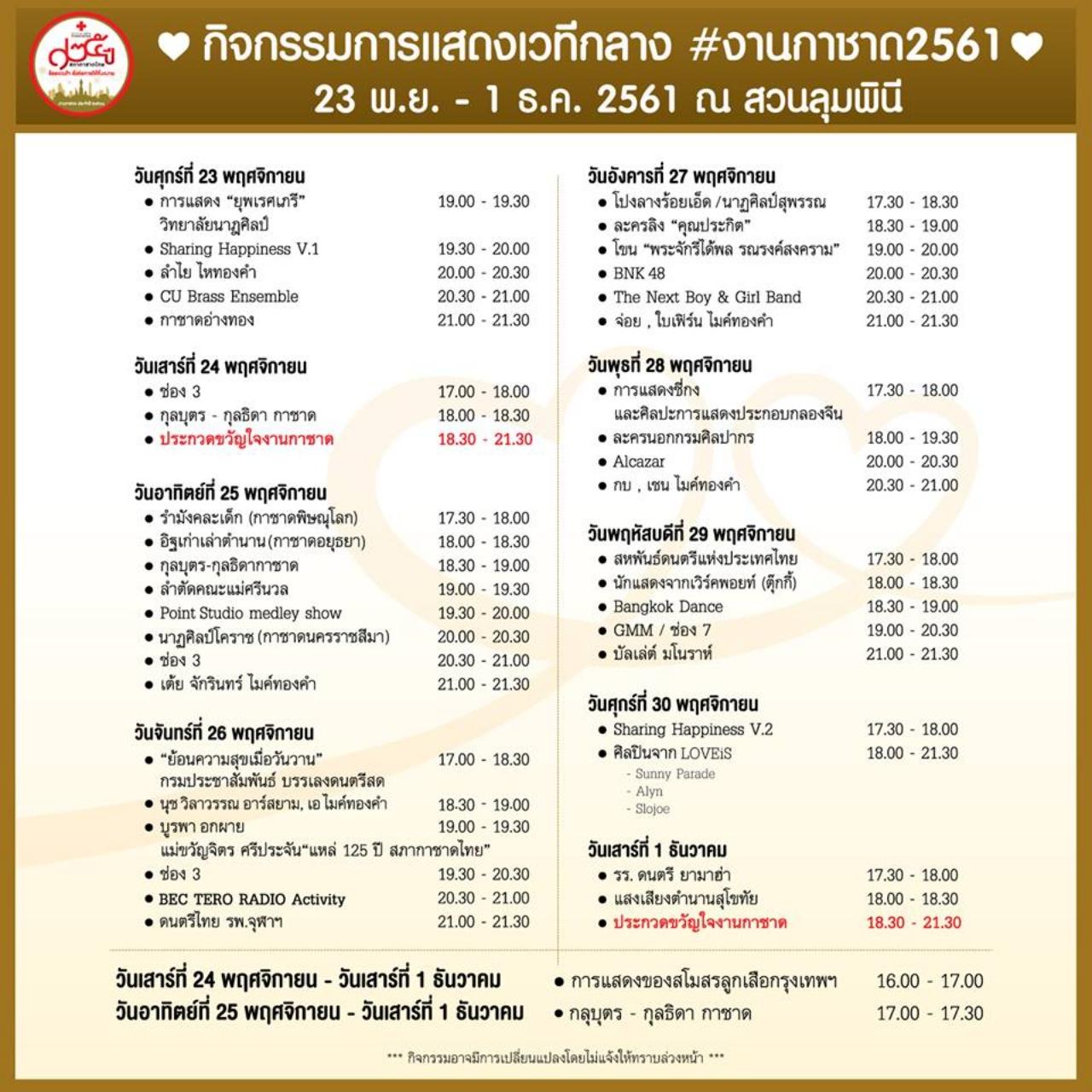 หากพูดถึงงานมหรสพการกุศลที่อยู่คู่คนไทยมาอย่างยาวนาน ก็คงอดนึกถึง "งานกาชาด" ไม่ได้ และปีนี้ก็จัดอย่างใหญ่อลังการ สมกับเป็นงานประจำปีของคนไทย งานกาชาด ประจำปี 2561 ถือเป็นวาระในการเฉลิมฉลอง 125 ปี สภากาชาดไทยด้วย ซึ่งปีนี้จัดภายใต้แนวคิด "125 ปี สภากาชาดไทย ร้อยดวงใจส่งต่อการให้ที่งดงาม" โดยจัดขึ้น 9 วัน 9 วัน ที่ "สวนลุมพินี" ถนนพระรามที่ 4 กรุงเทพมหานคร ...(10 "ที่เที่ยว" ทั่วโลกที่รอคุณไปเที่ยวหน้าหนาว)