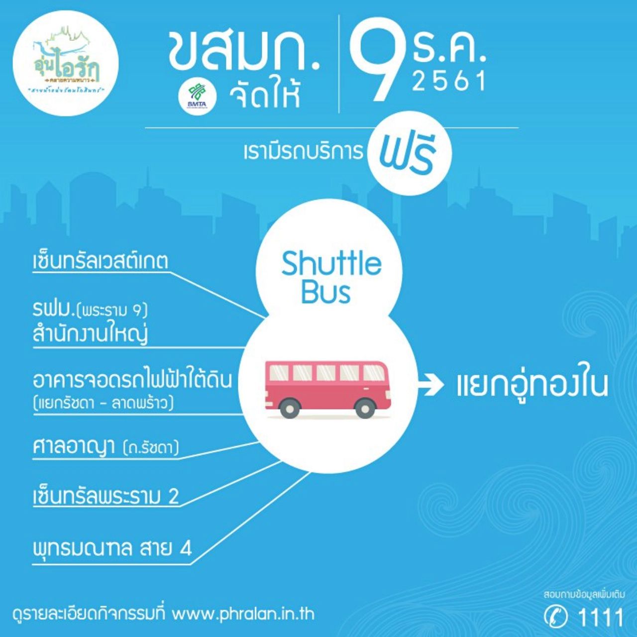 นักปั่นในกรุงเทพฯ ที่จะไปร่วมงาน "Bike อุ่นไอรัก" ในวันที่ 9 ธ.ค. 2561 สามารถเดินทางได้ฟรี! โดยมีบริการต่างๆ จากการขนส่งสาธารณะ ออกมาอำนวยความสะดวกให้นักปั่นมากมาย...("Bike อุ่นไอรัก" ดูเส้นทางปั่นจักรยานที่นี่)