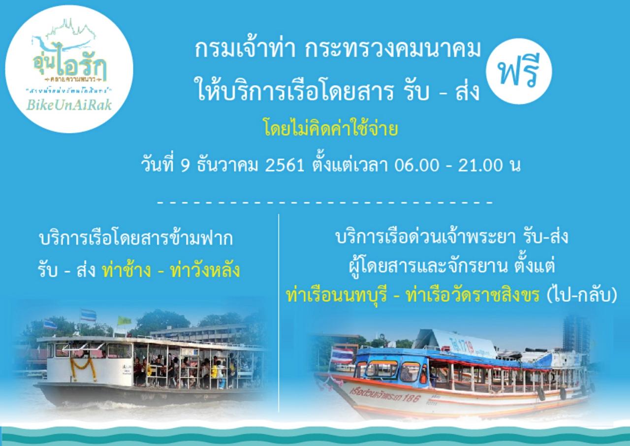 กรมเจ้าท่า กระทรวงคมนาคม ให้บริการเรือฟรี รับ-ส่ง ท่าเรือท่าช้าง-ท่าเรือวังหลัง และร่วมกับ บริษัท เรือด่วนเจ้าพระยา ให้บริการเรือฟรี จัดบริการเรือด่วนเจ้าพระยา รับ-ส่ง ผู้โดยสารและจักรยาน ตั้งแต่ท่าเรือ นนทบุรี-ท่าเรือวัดราชสิงขร (ไป- กลับ) ในวันที่ 9 ธันวาคม 2561 ตั้งแต่เวลา 06.00- 21.00 น.