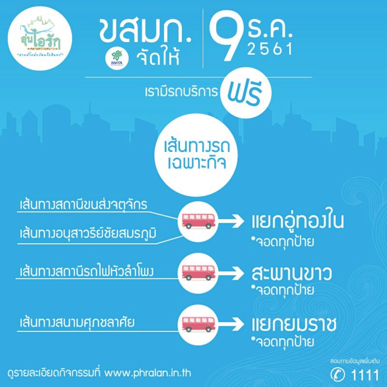 ขสมก. ให้บริการรถโดยสารสาธารณะ เข้าสู่งานอุ่นไอรัก คลายความหนาว สายน้ำแห่งรัตนโกสินทร์ วันที่ 9 ธ.ค. 61 เพื่อเป็นการอำนวยความสะดวกให้แก่ประชาชนที่ต้องการเข้าร่วมกิจกรรม อุ่นไอรัก คลายความหนาว "สายน้ำแห่งรัตนโกสินทร์" องค์การขนส่งมวลชนกรุงเทพ (ขสมก.) เปิดให้บริการรถโดยสารสาธารณะฟรี! ไม่เสียค่าใช้จ่าย