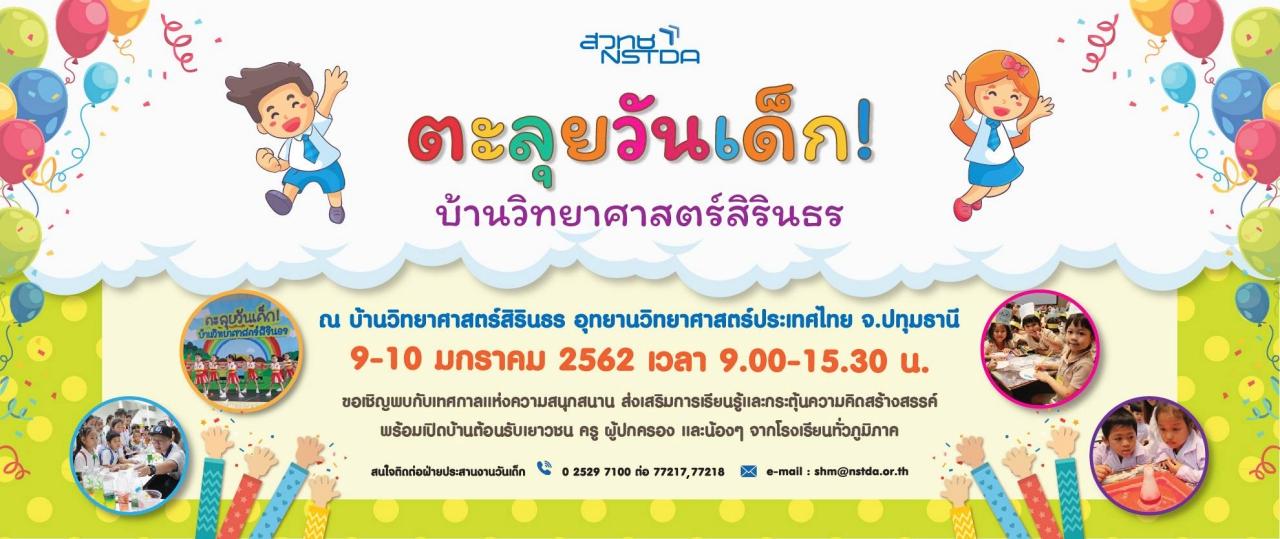 วันที่ 9-10 มกราคม 2562 สำนักงานพัฒนาวิทยาศาสตร์และเทคโนโลยีแห่งชาติ (สวทช.) กระทรวงวิทยาศาสตร์และเทคโนโลยี กำหนดจัดงานวันเด็กแห่งชาติ ประจำปี 2562 ในชื่องาน “ตะลุยวันเด็ก! บ้านวิทยาศาสตร์สิรินธร ปี’62” ณ บ้านวิทยาศาสตร์สิรินธร อุทยานวิทยาศาสตร์ประเทศไทย จ.ปทุมธานี