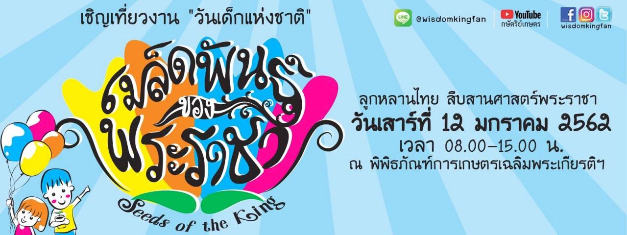 วันเด็กแห่งชาติ 12 มกราคม 2562 พบกับงานวันเด็กแห่งชาติ เมล็ดพันธุ์ของพระราชา ตั้งแต่เวลา 08.00-15.00 น. ณ พิพิธภัณฑ์เกษตรเฉลิมพระเกียรติฯ เรียนรู้ทักษะเกษตรเศรษฐกิจพอเพียงผ่านกิจกรรม Walk Rally วิถีเกษตร เช่น เพาะพันธุ์กล้าข้าว ตามล่าหาเมล็ดพันธุ์ นาปาเป้า ประดิษฐ์ว่าว และกิจกรรมเกษตรน่ารู้อื่นๆ อีกมากมาย พร้อมแลกรับของรางวัล สนุกตื่นเต้นกับภาพยนตร์แอนิเมชั่น 3 มิติ เป็นต้น
