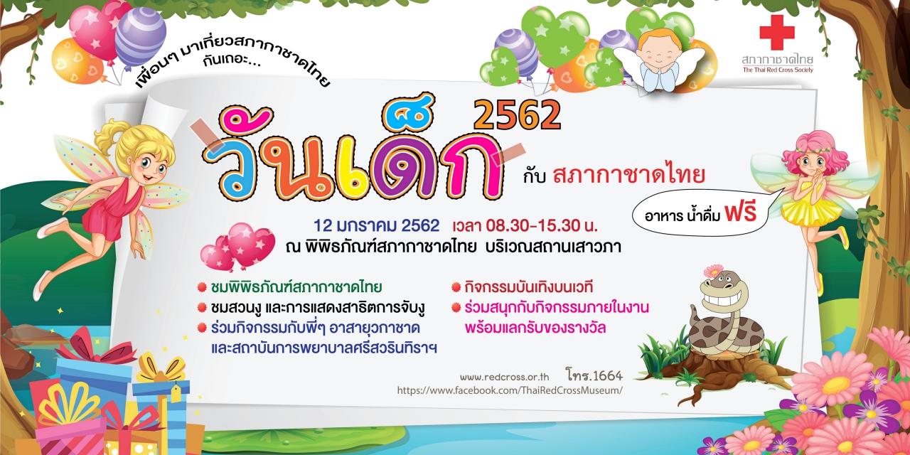 สภากาชาดไทยเชิญชวนเด็กและเยาวชนเข้าร่วมกิจกรรมงานวันเด็กแห่งชาติ ในวันเสาร์ที่ 12 มกราคม 2562 เวลา 08.30-15.30 น. ณ พิพิธภัณฑ์สภากาชาดไทย ถนนอังรีดูนังต์ เพื่อให้เด็ก เยาวชน และผู้ปกครองได้เรียนรู้และทำกิจกรรมร่วมกันในรูปแบบต่างๆ จะได้รับความรู้ ความสนุกสนาน ความบันเทิง อีกทั้งสอดแทรกความรู้และภารกิจหลักของสภากาชาดไทย รวมทั้งปลูกฝังการมีจิตอาสา