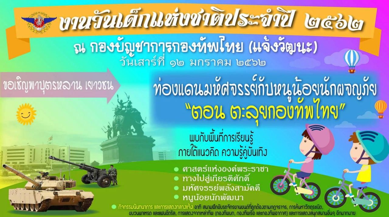 ถัดมาอยากจะชวนไปเที่ยวงานวันเด็ก จัดโดยกองบัญชาการกองทัพไทย ชวนน้องๆ เข้าร่วมกิจกรรมงานวันเด็กแห่งชาติ ประจำปี 2562 ปีนี้จัดขึ้นในตอน "ตะลุยกองทัพไทย" ภายในงานพบกับพี่ๆ นักเรียนเตรียมทหารและนักเรียนพยาบาล 3 เหล่าทัพ อย่างใกล้ชิด ตั้งแต่เวลา 08.00-14.00 น. ณ ลานอเนกประสงค์ กองบัญชาการกองทัพไทย ถนนแจ้งวัฒนะ กรุงเทพฯ