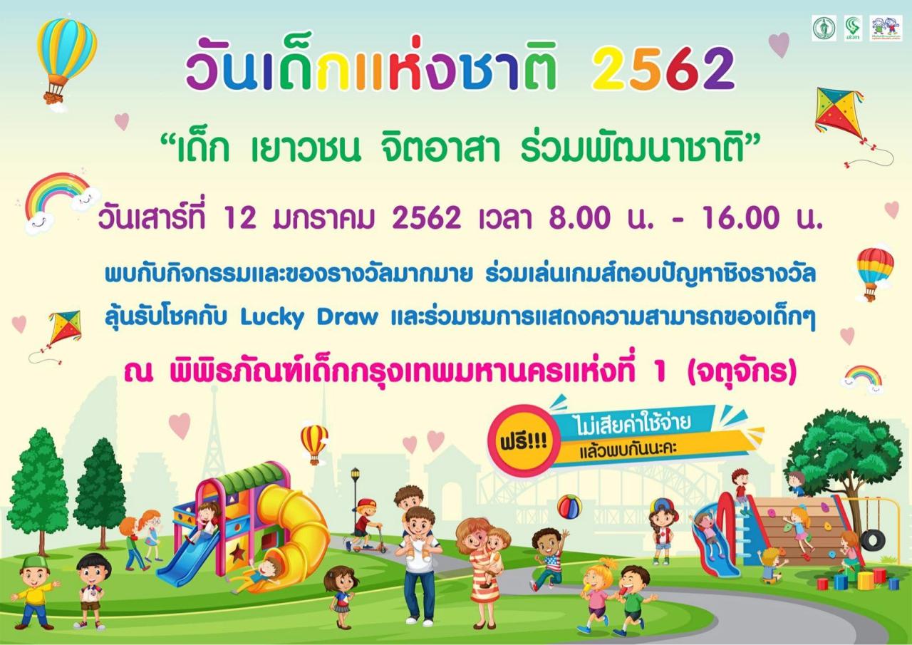 วันที่ 12 มกราคม 2562 ชวนน้องๆ หนูๆ เข้าร่วมกิจกรรมวันเด็ก ปี 2562 พบกับกิจกรรมและของรางวัลมากมาย ร่วมเล่นเกมตอบปัญหาชิงรางวัล ลุ้นรับโชคกับ Lucky Draw และร่วมชมการแสดงความสามารถของเด็กๆ ได้ที่พิพิธภัณฑ์เด็กกรุงเทพมหานครแห่งที่ 1 (จตุจักร) เข้าเที่ยวได้ฟรี ไม่มีค่าใช้จ่ายใดๆ
