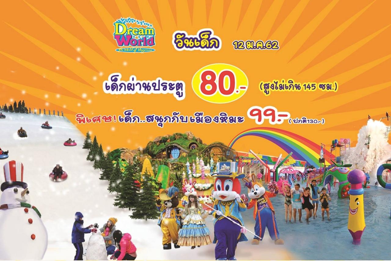วันเสาร์ที่ 12 มกราคม 2562 ชวนเด็กมาเที่ยวสวนสนุกดรีมเวิลด์ เพื่อฉลองวันเด็กแห่งชาติ 2562 กับโปรโมชั่นสุดพิเศษ เด็กสูงไม่เกิน 145 ซม. จ่ายค่าบัตรผ่านประตู เพียง 80 บาทเท่านั้น (จากปกติ 200 บาท) พิเศษสำหรับเด็กๆ ที่อยากไปเที่ยวสนุกกับเมืองหิมะ จ่ายค่าตั๋วเพิ่มเพียง 99 บาท (จากปกติ 130 บาท)
