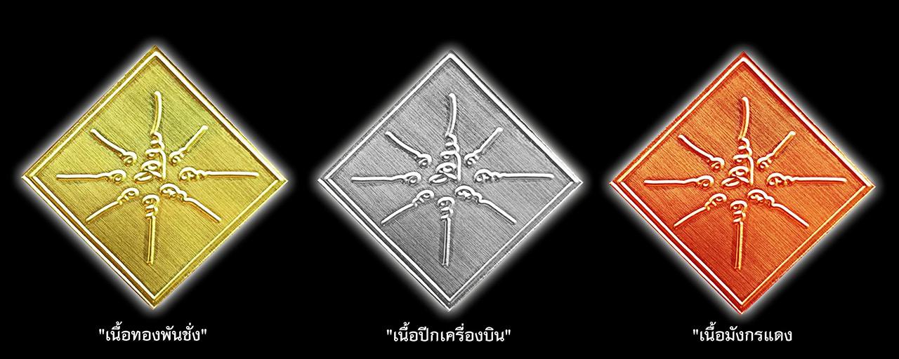 ...มีอุณาโลมชี้ไปทุกทิศ รายล้อมยันต์พุทธนะฤาชา เพื่อสื่อเป็นนัยว่า “ไปทิศหนึ่งทางใดก็ดี ไปทิศหนึ่งทางใดก็รวย” จัดสร้างด้วยกันทั้งหมด 3 เนื้อ ได้แก่ เนื้อปีกเครื่องบิน (อะลูมิเนียม) จำนวน 999 แผ่น, เนื้อทองพันชั่ง (ทองฝาบาตร) จำนวน 4,500 แผ่น, เนื้อมังกรแดง (ทองแดง) จำนวน 4,500 แผ่น รวมจำนวนการจัดสร้างทั้งสิ้น 9,999 แผ่น ถูกบรรจุไว้ในซองอั่งเปา 1 แผ่น ต่อ 1 ซอง แผ่นยันต์โลหะนี้สามารถนำไปเลี่ยมแขวน, ไปม้วนเป็นตะกรุดหรือพกใส่กระเป๋าสตางค์เพื่อเสริมดวง เสริมโชคลาภ แก้เคล็ด แก้ปีชงได้
