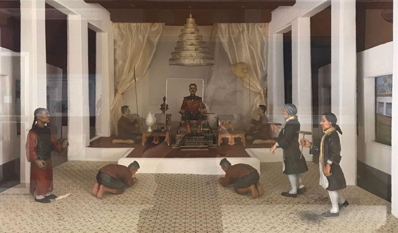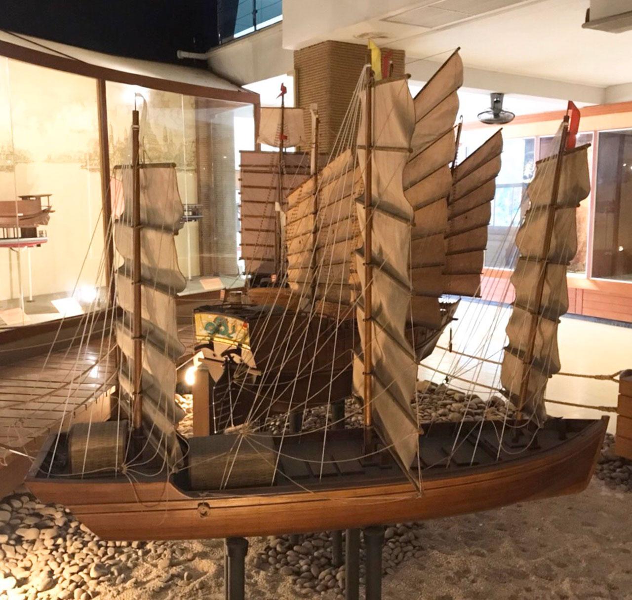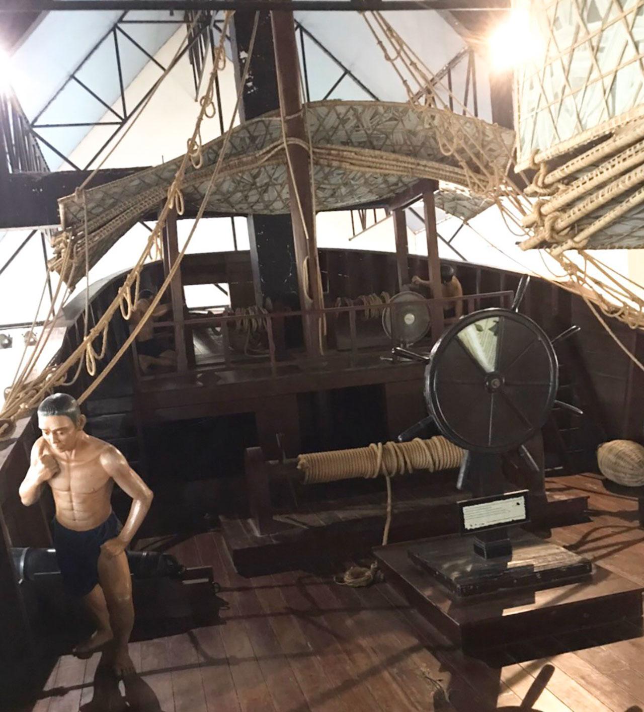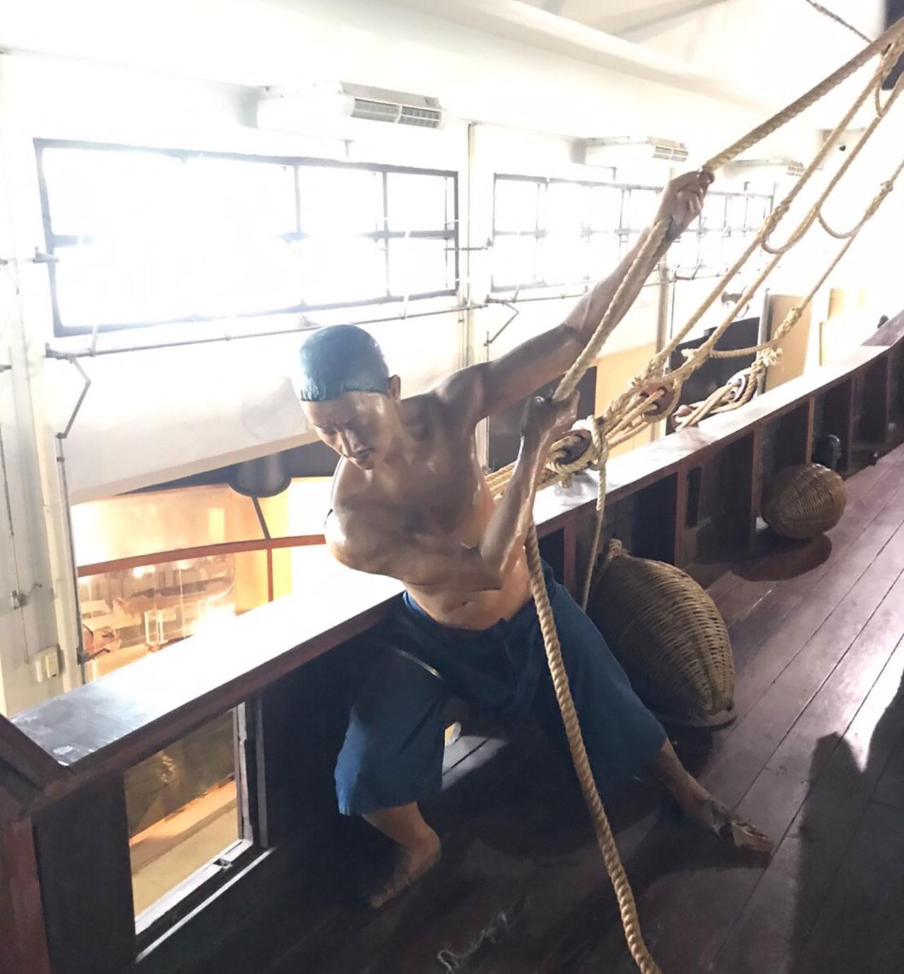 กรมศิลปากร เขาจำลอง “เรือหน้ายักษ์” ขนาดเท่าของจริง ที่ภัณฑารักษ์ที่นี่บอกว่า เป็นเรือสำเภาลำเล็กสุด แต่สำหรับผมแล้ว เล็กสุดยังไง ก็ยังใหญ่มากครับ มาตั้งไว้กลางห้อง ลักษณะเป็นเรือสำเภาโบราณ ด้านข้างสองข้าง มีตาเรือกลมๆ เจ้าหน้าที่ บอกว่า ตาเรือแบบนี้เป็นตาเรือสินค้า ถ้าสังเกตดีๆ ตาดำจะมองออกไปข้างหน้า ส่วนถ้าเป็นเรือที่มีตาดำมองต่ำลงไปในทะเล นั่นคือ เรือประมง แต่ถ้าเจอเรือที่มีรูปตาตัดเหลือเพียงครึ่งเดียวลอยมาหา ก็ต้องหนีทันทีเพราะนั้นคือเรือโจรสลัด