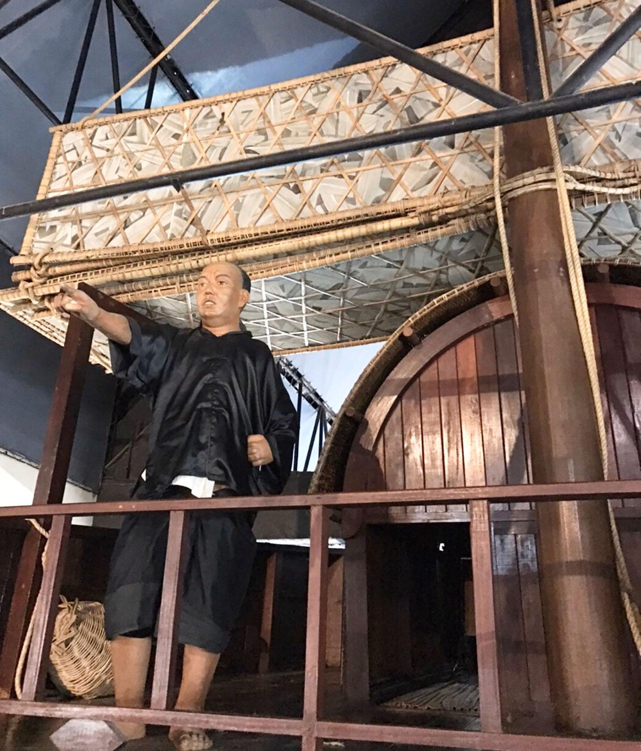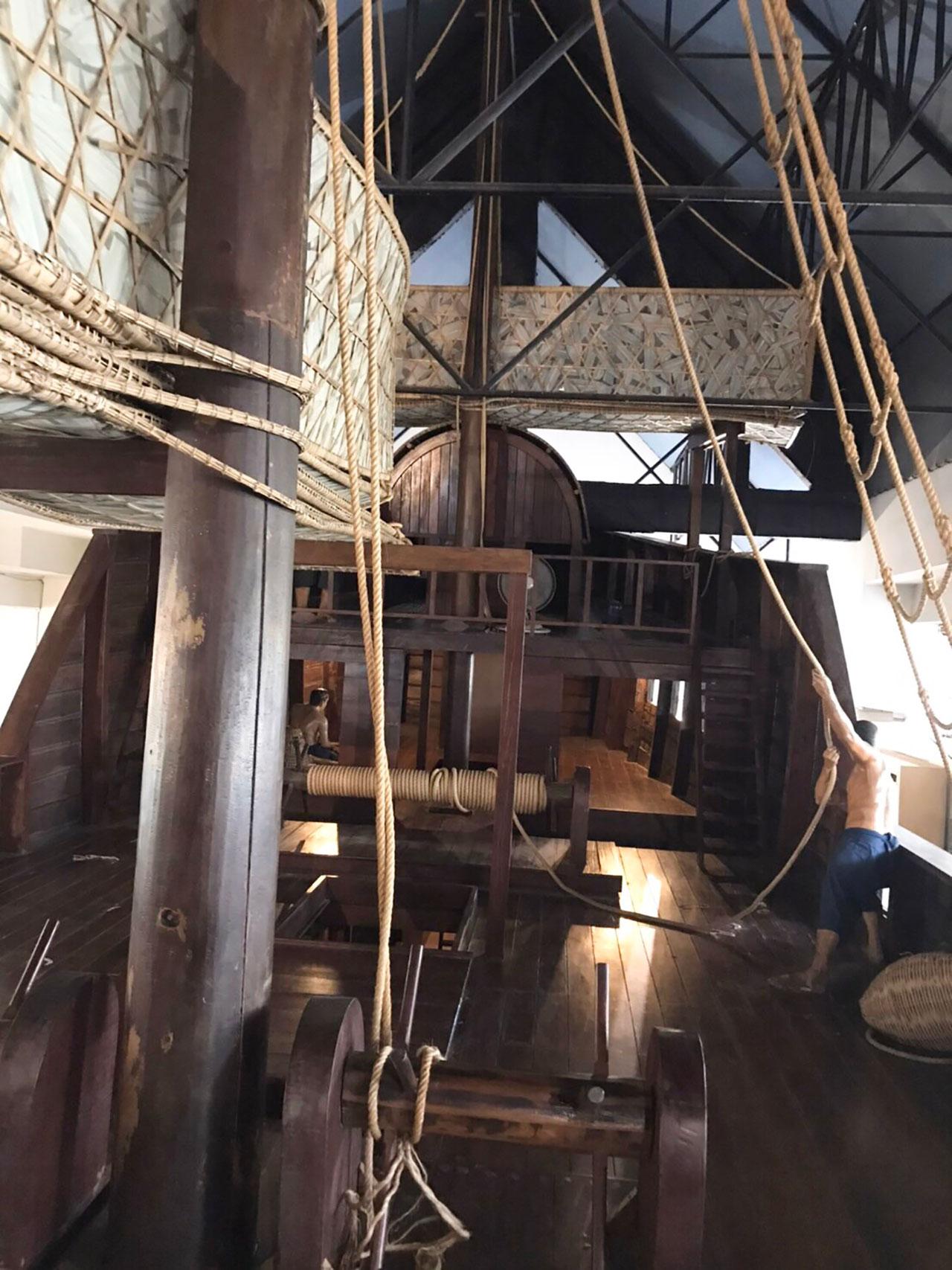 เรือลำนี้มี 2 ชั้นครับ ผมเริ่มสำรวจที่ชั้น 2 ของเรือก่อน บนชั้นสองของเรือลำนี้ มีองค์ประกอบสำคัญๆ ของเรือสำเภาโบราณ ครบถ้วนครับ ไม่ว่าจะเป็น ใบเรือ พังงาเรือ ลูกตะเภาสำหรับกันเรือกระแทกที่ทำด้วยหวาย และยังจัดแสดงวิถีชีวิตชาวเรือสมัยก่อน ที่มีทั้งจับกังหรือกุลี ที่ภาษาจีนเรียกว่า จุมโพ่ กำลังแบกกระสอบ มีคนคอยดึงเชือกใบเรือ ที่เรียกว่า "อาปั๋น" กำลังทำท่าสาวดึงใบเรือ ใกล้ๆ กันมี เฒ่าเต้ง ทำหน้าที่ดูแลสมอเรือ โดยมีกัปตันเรือหรือไต้ก๋งยืนคุมคนงานอยู่บนชั้นดาดฟ้าอีกที