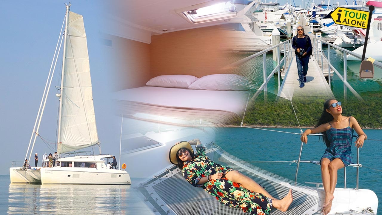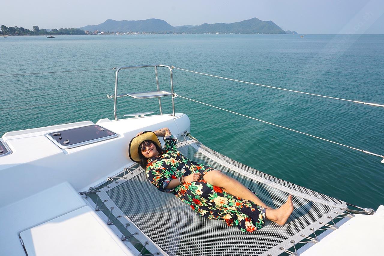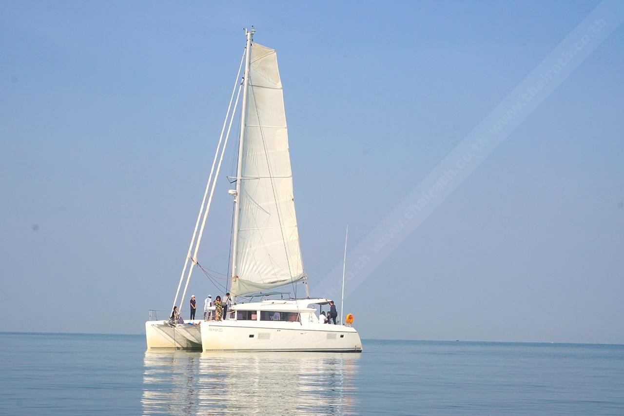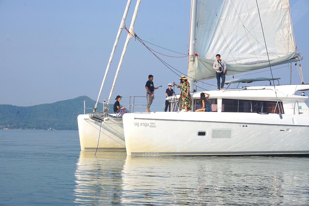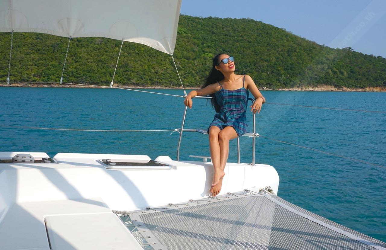 จังหวะก้าวขาขึ้นเรือเล็ก เพื่อข้ามไปยังเรือยอร์ชลำนี้ บอกแบบไม่อายว่าตื่นเต้น เพราะเป็นการนั่งเรือคาตามารัน (Catamaran) ครั้งแรกในชีวิต ถ้าใครนึกหน้าตาเรือไม่ออก ให้นึกถึงมิวสิกวิดีโอที่มีฉากล่องเรือเที่ยวสวยๆ ดูไฮโซ หรูหรา นั่นแหละ...แบบนั้นเลย