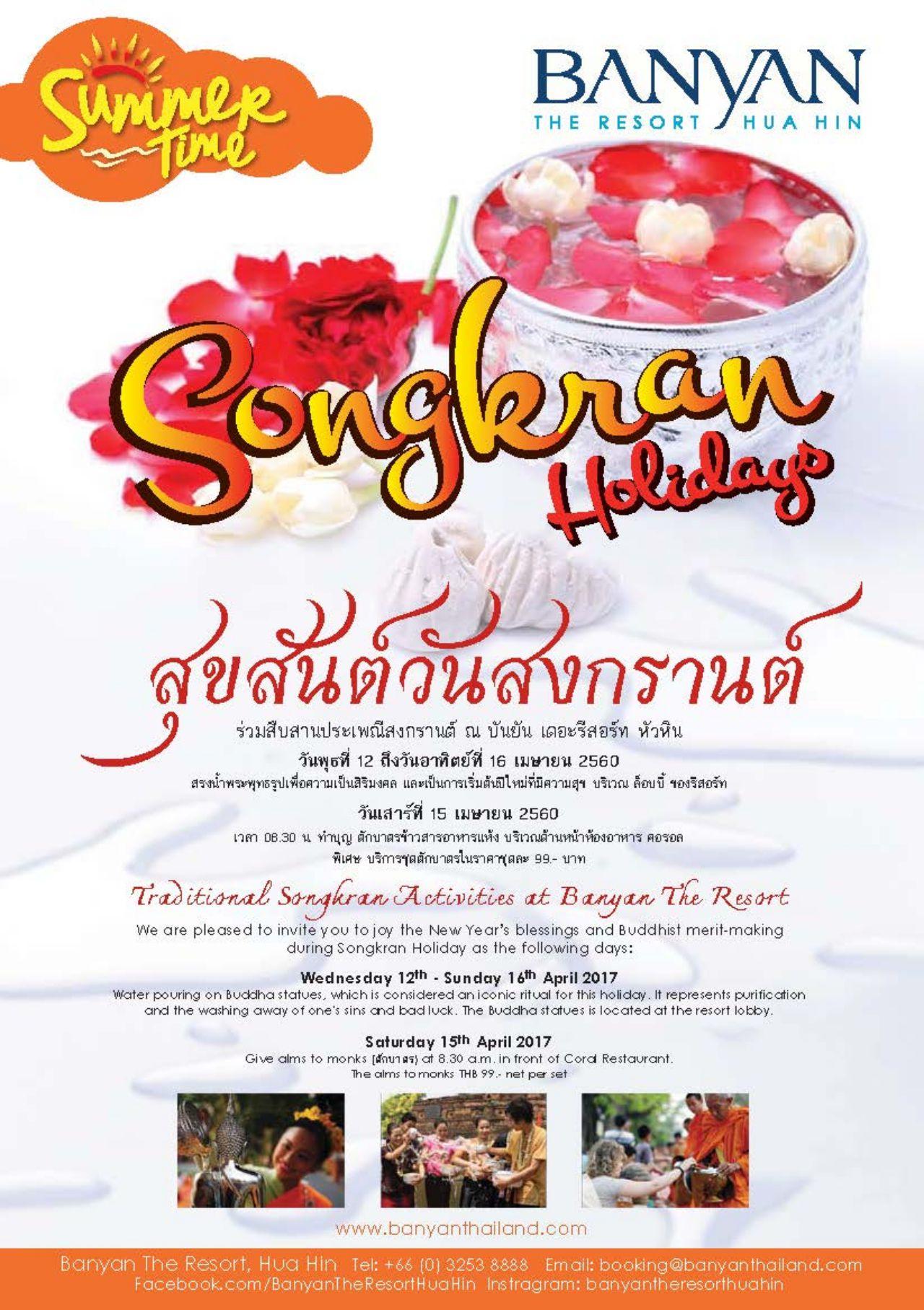 วันที่ 12 - 16 เมษายน 2560 ชวนมาสรงน้ำพระพุทธรูปเพื่อความเป็นสิริมงคล ที่ BANYAN THE RESORT HUA HIN (บันยัน เดอะรีสอร์ท หัวหิน) และยังร่วมเป็นส่วนหนึ่งในการสืบสานประเพณีสงกรานต์ จัดสรงน้ำพระพุทธรูปเพื่อความเป็นสิริมงคลตลอดเทศกาล พร้อมเชิญชวนนักท่องเที่ยวและประชาชน ร่วมกันทำบุญตักบาตรข้าวสารอาหารแห้งโดยพร้อมเพรียงกัน ในวันเสาร์ที่ 15 เมษายน 2560 บริเวณด้านหน้าห้องอาหาร คอรอล ตั้งแต่เวลา 08.30 น. เป็นต้นไป สามารถดูรายละเอียดเพิ่มเติมได้ที่ www.banyanthailand.com หรือ โทร. 0-3253-8888