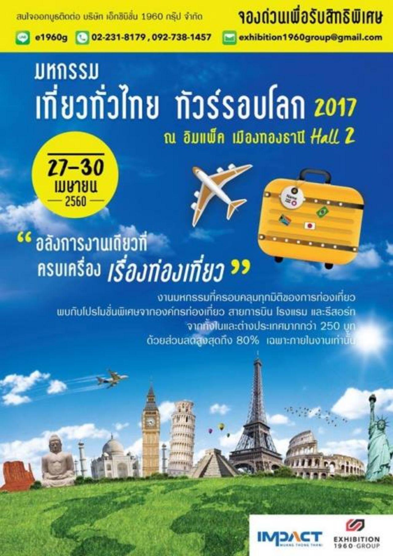 วันที่ 27 - 30 เมษายน 2560 เวลา 10.00 - 20.00 น. ชวนมาเที่ยวงาน “มหกรรมเที่ยวทั่วไทย ทัวร์รอบโลก 2017” ณ อิมแพ็ค เมืองทองธานี ฮอลล์ 2 ภายในงานพบกับ มหกรรมธุรกิจท่องเที่ยวทุกแขนงทั้งในไทยและต่างประเทศที่ครบถ้วนที่สุด รวบรวมโปรโมชั่นสุดพิเศษ พร้อมแพ็กเกจท่องเที่ยวระดับ World-Class จากที่พัก โรงแรม รีสอร์ต บริษัททัวร์ และสายการบินดัง ทั้งไทย และต่างประเทศ พร้อมกิจกรรมแจกส่วนลด Voucher ให้กับผู้เข้าชมงานได้ร่วมสนุกและลุ้นไปพร้อมๆ กัน