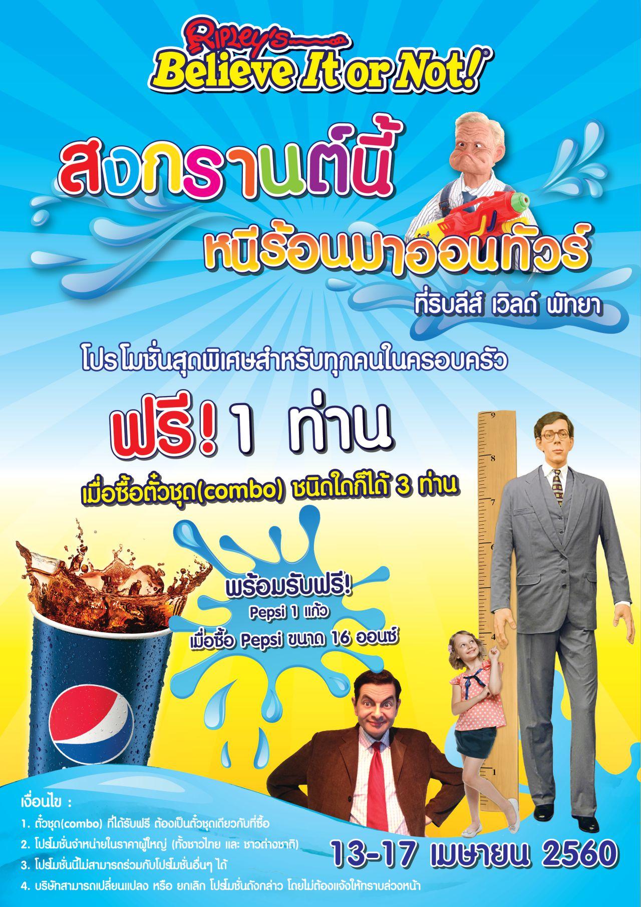 วันที่ 13-17 เมษายน 2560 ชวนมาเที่ยวสนุกสนานทั้งครอบครัวกับโปรโมชั่นพิเศษ “สงกรานต์นี้ หนีร้อนมาออนทัวร์” ณ ริบลีส์ เวิลด์ พัทยา ชั้น 2 ศูนย์การค้ารอยัล การ์เด้น พลาซ่า พัทยาใต้ เมื่อซื้อตั๋วชุด Combo ชนิดใดก็ได้ 3 ท่าน ฟรี! 1 ท่านทันทีและรับฟรี! เป็ปซี่ 1 แก้วเมื่อซื้อเป็ปซี่ขนาด 16 ออนซ์อีกด้วย มาร่วมสนุกคลายร้อนพร้อมสาดความมันต้อนรับเทศกาลสงกรานต์ สามารถดูรายละเอียดและเงื่อนไขเพิ่มเติมได้ที่ http://www.ripleysthailand.com หรือ โทร. 0-3871-0294