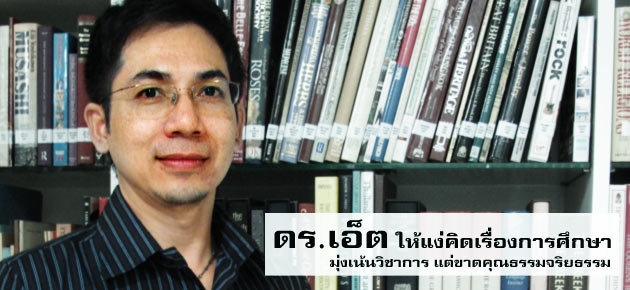 ในฐานะที่เป็นครูและคนรุ่นใหม่ ดร.เอ็ต บอกว่า "สังคมเราที่แย่ลงตอนนี้ ส่วนหนึ่งมาจากการศึกษาที่เราเน้นแต่เก่ง แต่ขาดคุณธรรมจริยธรรม ฉลาดแต่โกงกิน บางทีเราคงต้องย้อนไปดูเวลาเริ่มต้นการศึกษา น่าจะได้เรียนควบคู่ไปกับศาสนา พร้อมกับปลูกฝังเรื่องศีลธรรมจริยธรรม ก่อนเน้นเรื่องวิชาการ"