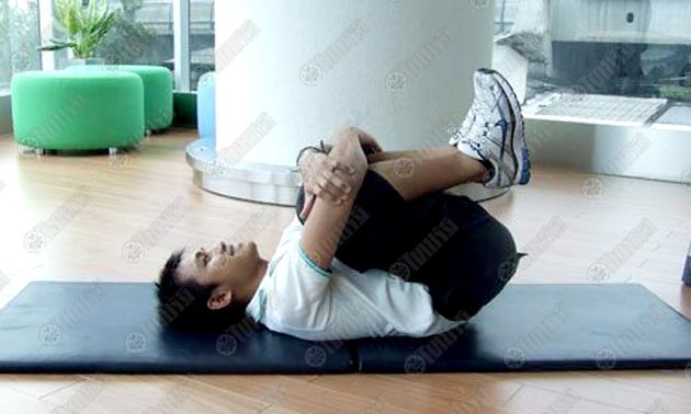 วิธีการยืดกล้ามเนื้อหลังส่วนล่าง นอนหงาย กอดเข่าทั้งสองข้างให้เข้ามาชิดหน้าอก จนรู้สึกตึงบริเวณหลังช่วงล่าง ค้างไว้ประมาณ 10-30 วินาที ทำซ้ำ 3-4 รอบ