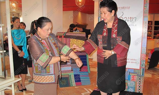 ท่านผู้หญิงจรุงจิตต์ ทีขะระ แนะนำผ้าชาวเขาจากชุดของท่านผู้หญิงอรนุช อิศรางกูร ณ อยุธยา ที่ช่วยเป็นพรีเซ็นเตอร์.