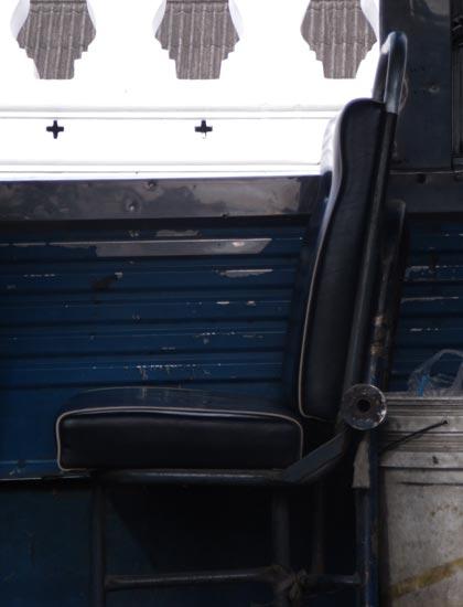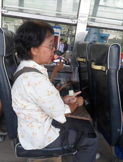"ปกติรถเมล์ที่ขึ้นบ่อยๆ ก็รถเอกชนสีขาว-น้ำเงิน ค่ะ เป็นรถร้อน เบาะนั่งก็ไม่แข็งมาก แต่ที่พิงมันไม่ค่อยรับกับกระดูกสันหลังเท่าไหร่ ยิ่งเวลารถติดนั่งบิดแล้วบิดอีก เราก็อายุไม่น้อยแล้ว มันเลยยิ่งมีผลมาก แต่ก็ทำอะไรไม่ได้หรอกค่ะ ยังไงเราก็ต้องอาศัยรถเมล์"