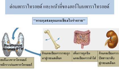 ก่อน อื่นต้องทำความเข้าใจก่อนว่า ต่อมพาราไทรอยด์นั้นแตกต่างจากต่อมไทรอยด์โดยสิ้นเชิง คำว่า “พารา” ที่อยู่หน้าคำว่าไทรอยด์มีความหมายว่า ข้างเคียง ดั้งนั้นคำว่า “พาราไทรอยด์” ก็คือ “ต่อมเคียงไทรอยด์” ซึ่งเป็นการบอกแค่ว่า ต่อมนี้อยู่ด้านหลังไทรอยด์ มีจำนวน 4 ต่อม ขนาดเท่าเม็ดถั่วเขียว ถ้าจะเปรียบเทียบความแตกต่างของหน้าที่การทำงาน ก็คือ ต่อมไทรอยด์เป็นเหมือนน้ำมันเชื้อเพลิง ช่วยในการเผาผลาญอาหาร ผลิตความร้อนให้ร่างกาย ช่วยให้หัวใจเต้นปกติ รวมทั้งทำให้ระบบประสาทอัตโนมัติ ได้แก่ สมองทำงานเป็นปกติ ส่วนต่อมพาราไทรอยด์เป็นเหมือนโครงสร้างรถ คือมีหน้าที่ปรับสมดุลแคลเซียมในร่างกาย คือดึงแคลเซียมออกจากกระดูกมายังกระแสเลือด ดูดกลับแคลเซียมที่ท่อไตมาสู่กระแสเลือด รวมทั้งช่วยในการทำงานของวิตามินดีให้เป็นปกติ ซึ่งมีผลต่อการดูดซึมแคลเซียมในลำไส้