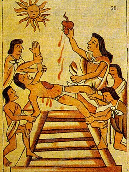 ชาวแอสเท็กซ์ก็ไม่แพ้กันครับ พวกเขามีตำนานความเชื่อว่ามนุษย์เป็นหนี้โลหิตของพระเจ้าที่ทรงสละชีพเพื่อสร้างโลกขึ้นมา ทำให้ชาวแอสเท็กซ์ต้องทำการบูชายัญมนุษย์ เพื่อป้องกันมิให้เทพเจ้าพิโรธ และทำลายโลกของพวกเขาลงไป ดังนั้น จากภาพพิธีกรรมของชาวแอสเท็กซ์ที่หลงเหลือมาให้พวกเราได้พบเห็น จึงเต็มไปด้วยความโหดร้ายของการบูชายัญ เช่น การควักหัวใจของเหยื่อเพื่อบูชาเทพเจ้า นับว่าสยดสยองเป็นอย่างยิ่ง