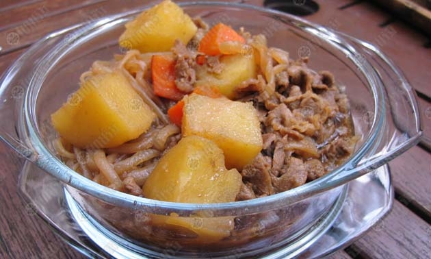 เครื่องปรุง : เนื้อสามชั้นไทยเฟรนช์สไลด์บางๆ 200 กรัม/ปลาโอแห้งสไลด์ ฝอยๆใช้ทำน้ำซุป หรือจะใช้น้ำซุปผงฮอนดาชิก็ได้/ซีอิ๊วญี่ปุ่น/มิริน (ซอสปรุงรสชนิดหนึ่งซึ่งหมักจากข้าวญี่ปุ่น จะมีรสหวาน)/น้ำตาลทราย/น้ำมันพืช/ เส้นคอนยักกุ หรือเส้นบุก/หอมหัวใหญ่/มันฝรั่ง
