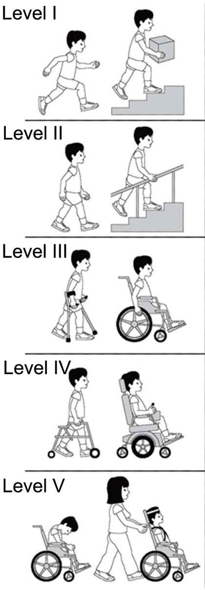 Level I เป็นระดับที่เก่งที่สุด เด็กสามารถเดินได้โดยไม่ต้องมีเครื่องช่วย สามารถขึ้นบันไดได้ โดยไม่ต้องใช้มือจับราวบันได ในขณะที่ระดับ Level II ต้องใช้มือจับราวบันได แต่ก็เดินได้เองไม่ต้องใช้เครื่องช่วย Level III ต้องใช้เครื่องมือช่วยทรงตัวในการเดิน เมื่อเดินทางไกลยังต้องพึ่งรถเข็น โดยเป็นรถเข็นที่สามารถใช้มือตัวเองพารถเข็นไปได้ ส่วน Level IV แย่กว่า ต้องใช้เครื่องช่วยเกาะทรงตัวขนาดใหญ่ และเดินได้เฉพาะระยะทางในบ้านสั้นๆ ต้องใช้รถเข็นพิเศษแบบไฟฟ้า หรือใช้คนช่วยดันรถเข็นไป ส่วนสุดท้ายคือ level V จะเห็นว่าแม้แต่นั่งก็ยังไม่ได้ หลังค่อมงอ ต้องใช้สายรัดรัดลําตัวไว้กับรถเข็น ต้องใช้รถเข็นแบบมีคนช่วยเสมอ
